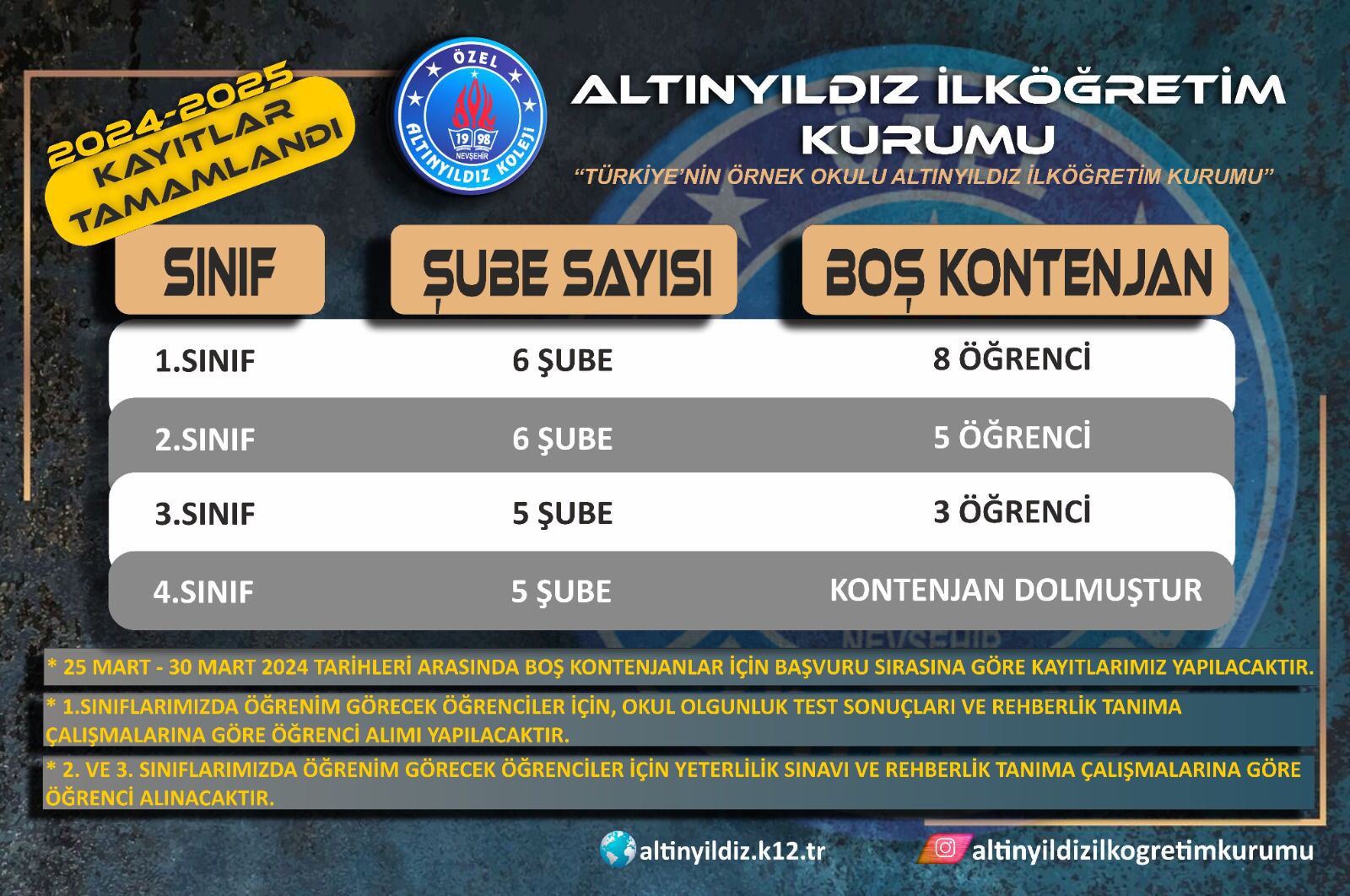 · 25 Mart–30 Mart 2024 tarihleri arasında boş kontenjanlar için başvuru sırasına göre kayıtlarımız yapılacaktır.