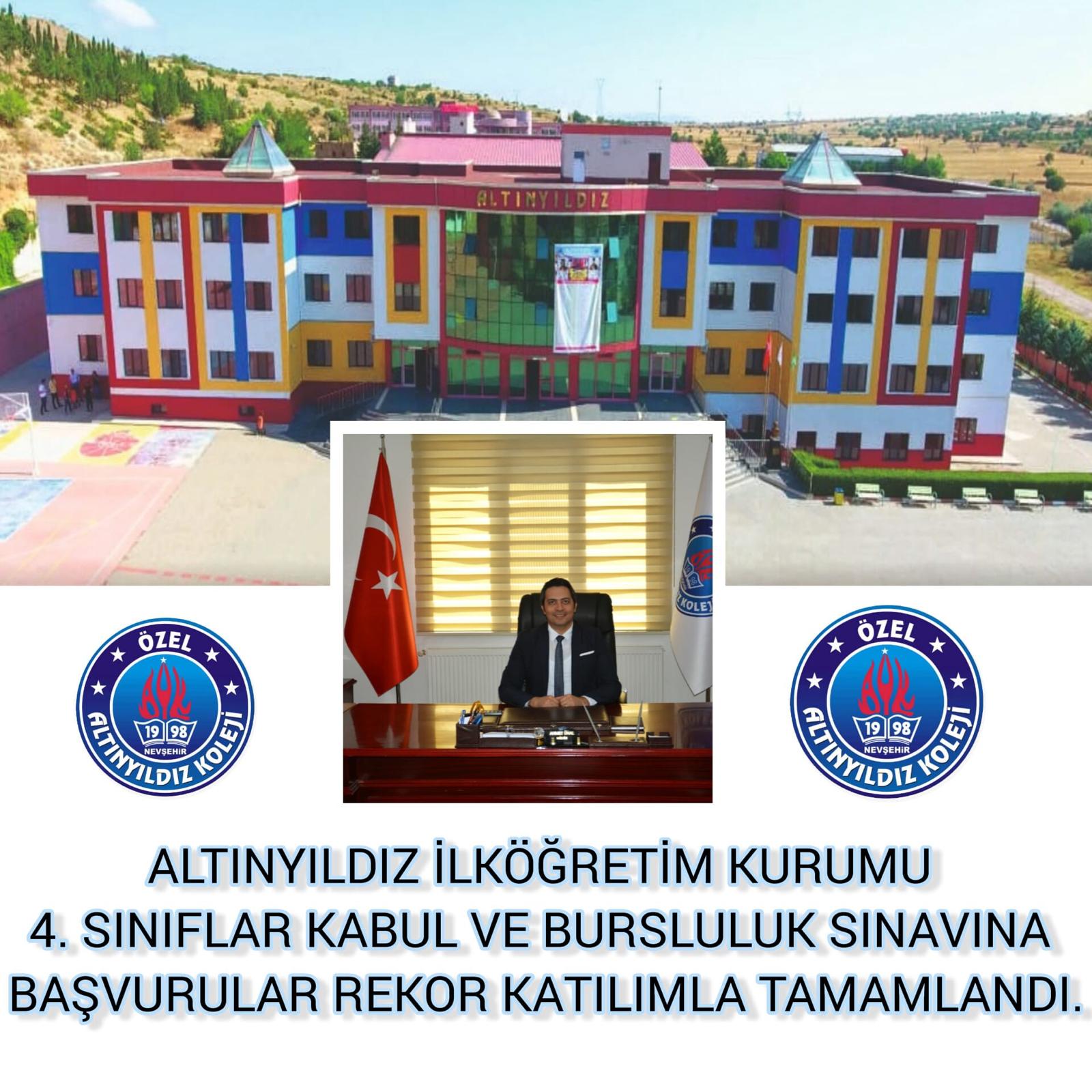 Kurum Müdürü Ahmet ÜNAL “ 4. Sınıflar kabul ve bursluluk sınavı başvuruları https://sinav.altinyildiz.k12.tr/kayit web adresinden yapıldı. Sınavımızda sadece 1. Dönem sonuna kadar olan kazanımlardan sorular yer alacaktır. Kazanımlara okulumuz web sitesi https://www.altinyildiz.k12.tr/ web adresinden ulaşabilirsiniz. Türkçe 15, Matematik 15, Fen Bilimleri 15, Sosyal Bilgiler 5, Din Kültürü ve Ahlak Bilgisi 5 ve İngilizce dersinden 5 soru olmak üzere toplam 60 soru sorulacaktır. 3 yanlış 1 doğruyu götürecektir. Puan hesaplaması 2023 LGS katsayılarına göre yapılacaktır. Altınyıldız İlköğretim Kurumu’na kayıt hususunda sınava giren öğrencilerimizden ilk 500 sıralama içerisine giren öğrencilerimiz Altınyıldız İlköğretim Kurumu’na kayıt hakkı kazanacaktır. Kayıtlar başarı sıralamasına göre randevu verilerek yapılacaktır. Nevşehir halkının sınavımıza göstermiş olduğu yoğun ilgiye teşekkür ederiz” dedi.