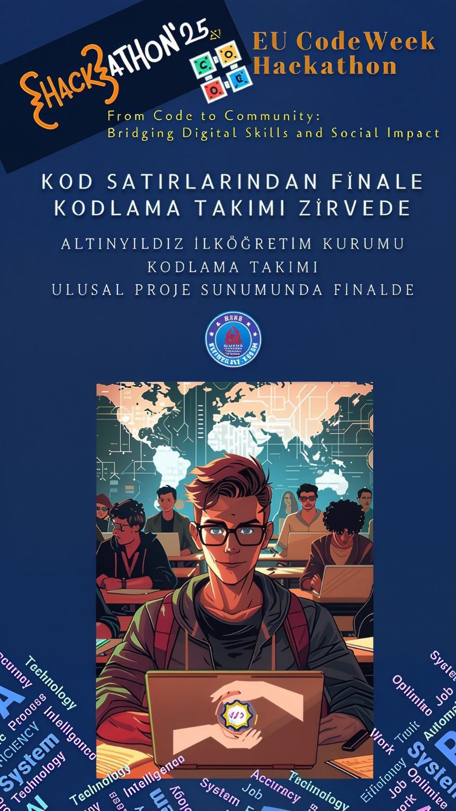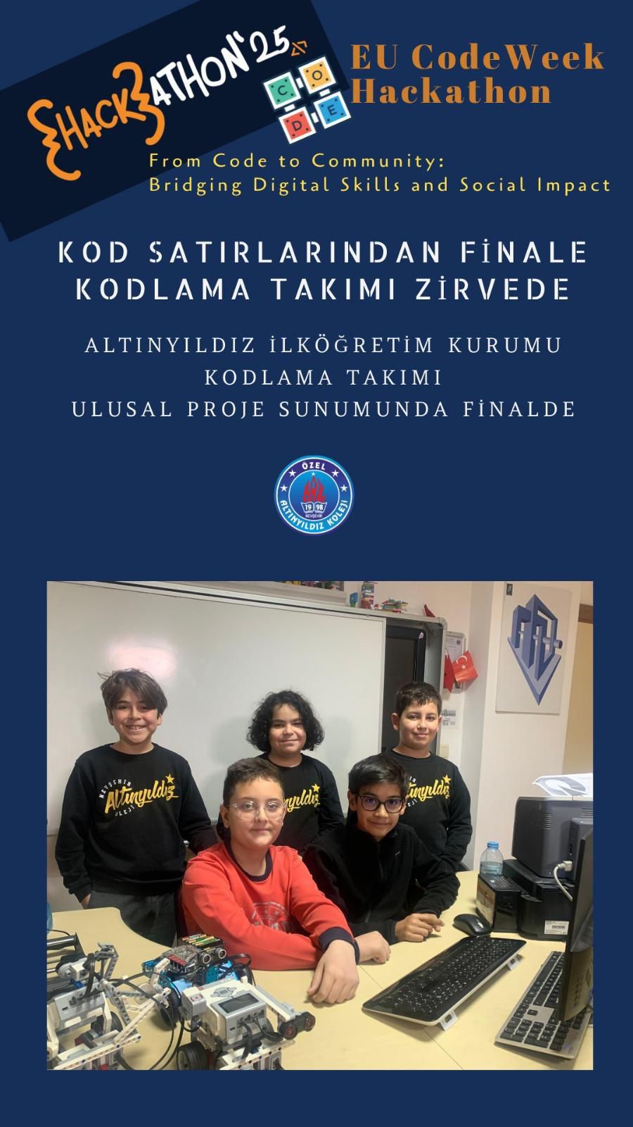 Altınyıldız İlköğretim Kurumu Kodlama Takımı EU Code Week Hackathonu — Avrupa EU Code Week (AB Kod Haftası) 2025 teması: “From Code to Community: Bridging Digital Skills and Social Impact” (Koddan Topluluğa: Dijital Beceriler ve Sosyal Etki) etkinliği kapsamında takımlara yönelik düzenlenen bir hackathon / teknoloji yarışmasında hazırladıkları “Raspberry Pi Mikroişlemci Kartı Üzerinde OpenCV ve TensorFlow ile Yapay Zekâ Destekli Görüntü Tanıma Sistemi” nin sunumunu yaptılar.