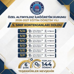 2026-2027 Eğitim Öğretim Yılı için Özel Altınyıldız İlköğretim Kurumu 5. sınıf kontenjanları tamamen doldu. Yoğun ilgi gören kayıt sürecinin ardından okul bünyesinde açılan 5/A, 5/B, 5/C, 5/D, 5/E ve 5/F şubelerinde eğitim görecek toplam 144 öğrenci kayıt işlemlerini tamamladı.