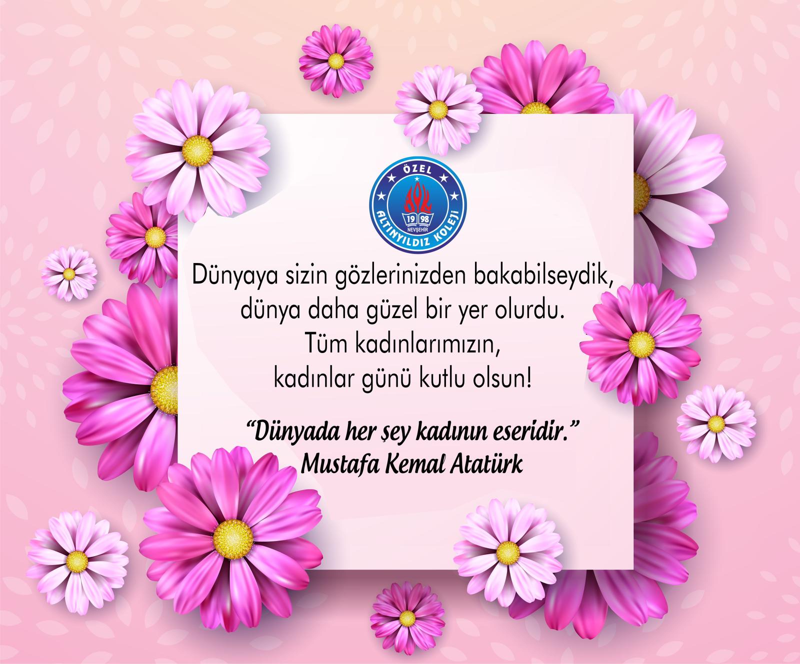 Kadınlar yaşamımızın doğumdan ölüme her anında küçük dokunuşları ile yaşamımıza anlam katan bizleri varlıkları ile onurlandıran, ihtiyacımız olduğunda desteklerini asla esirgemeyen, çevresini eğiten, yetiştiren, her zaman azimle yüreklendirip, sevgi ve şefkati karşılıksız verenlerdir.