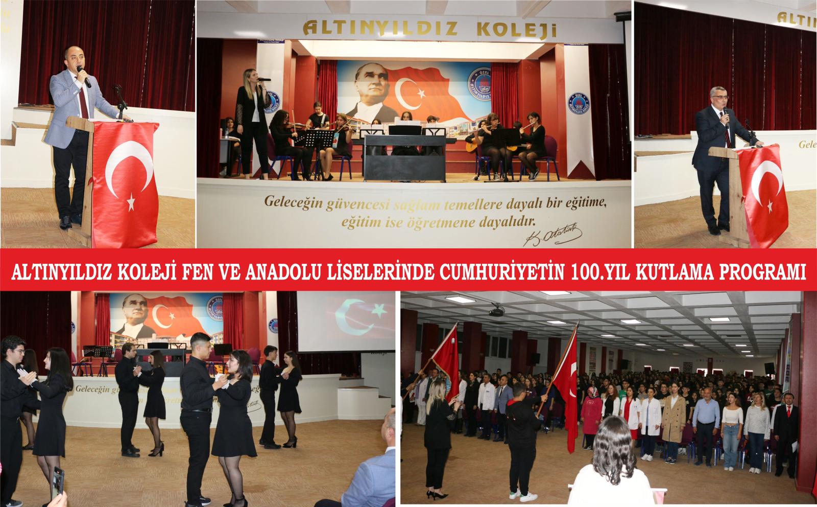 Altınyıldız Fen ve Anadolu Lisesi konferans salonunda düzenlenen “Cumhuriyetimizin 100. Yıl Programı” saygı duruşu ve İstiklal Marşı ile başladı. Daha sonra günün anlam ve önemini belirten konuşmayı Coğrafya Öğretmeni İbrahim Çağlak gerçekleştirdi. Program “Cumhuriyet” temalı şiirler ve sinevizyon gösterisiyle devam etti.