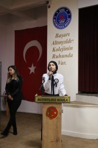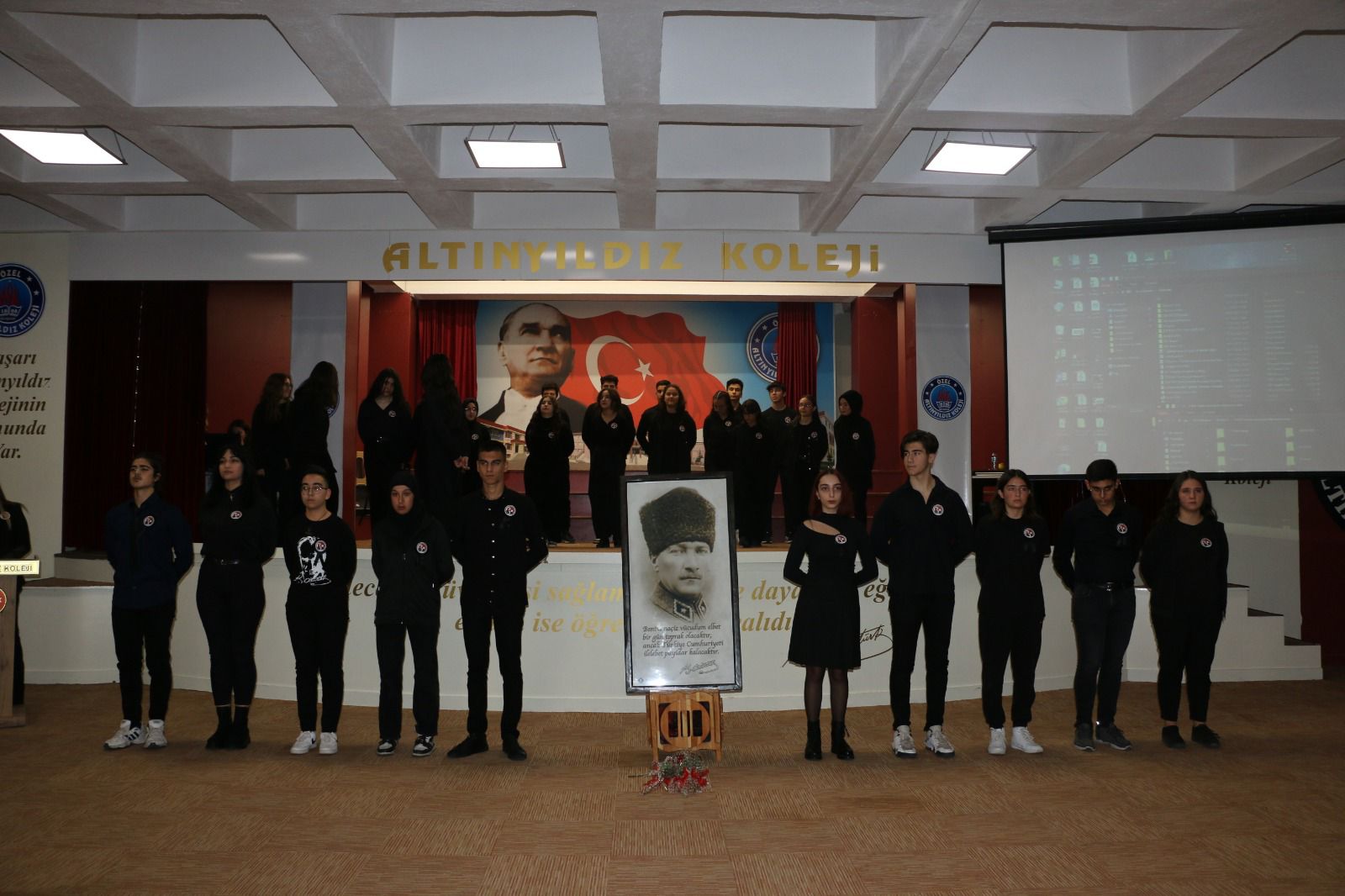 Altınyıldız Koleji konferans salonunda düzenlenen anma programı saat 9:05 geçe saygı duruşu ve İstiklal Marşının okunmasıyla başlamıştır. Ardından günün anlam ve önemini belirten konuşmayı Tarih öğretmeni Oğuz Balık yapmıştır. Daha sonra “Atatürk’ü Düşünüyorum” adlı şiiri 11 Fen öğrencilerimizden Elif Acer okumuştur. Programımızın devamında Türk Dili ve Edebiyatı öğretmenlerimizin hazırlamış olduğu “Atatürk” adlı oratoryo ve Atatürk’ün sevdiği müzikler ilgiyle izlenmiştir Duygulu anların yaşandığı programımızın sonunda Altınyıldız Koleji Fen ve Anadolu Liseleri öğrencileri Atatürk’ün Gençliğe Hitabesini okudular.