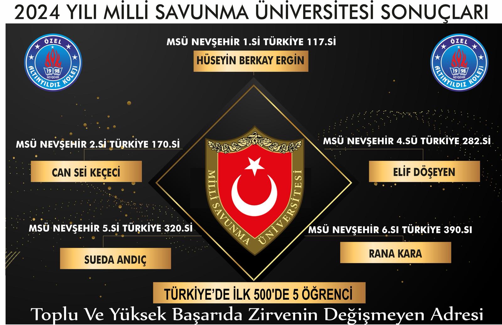Türkiye’nin Örnek Okulu Altınyıldız Koleji Fen ve Anadolu Lisesi 2024 Milli Savunma Üniversitesi Sınavı sonuçlarına göre bütün alanlarda (Sayısal, Eşit Ağırlık, Sözel ve Genel) Türkiye derecelerini ve Nevşehir Birinciliklerini kazanarak Nevşehir’in gururu olmuştur. Konuyla ilgili, açıklama yapan Altınyıldız Koleji Fen ve Anadolu Lisesi Müdürü Özkan KILINÇ,