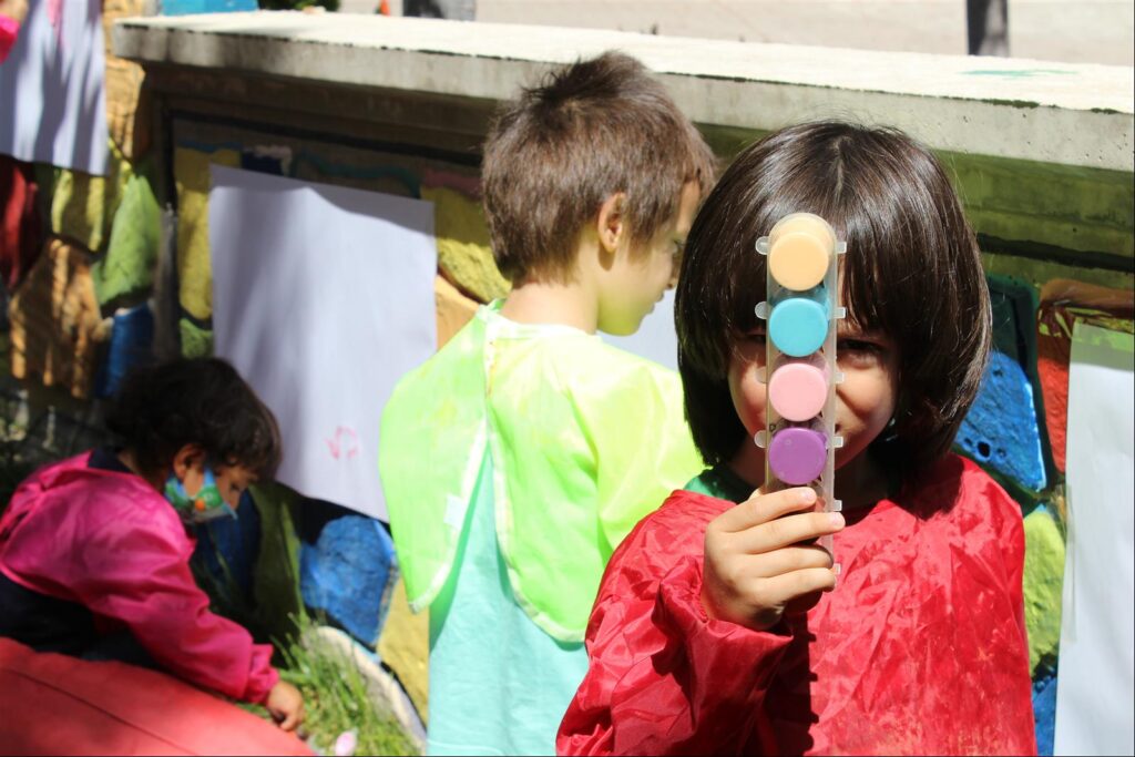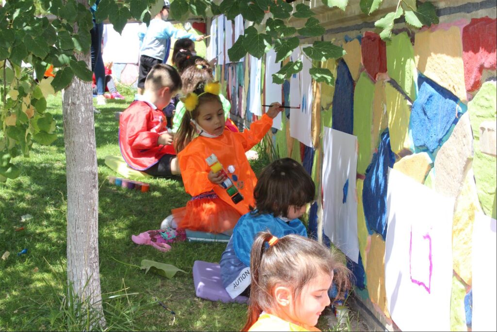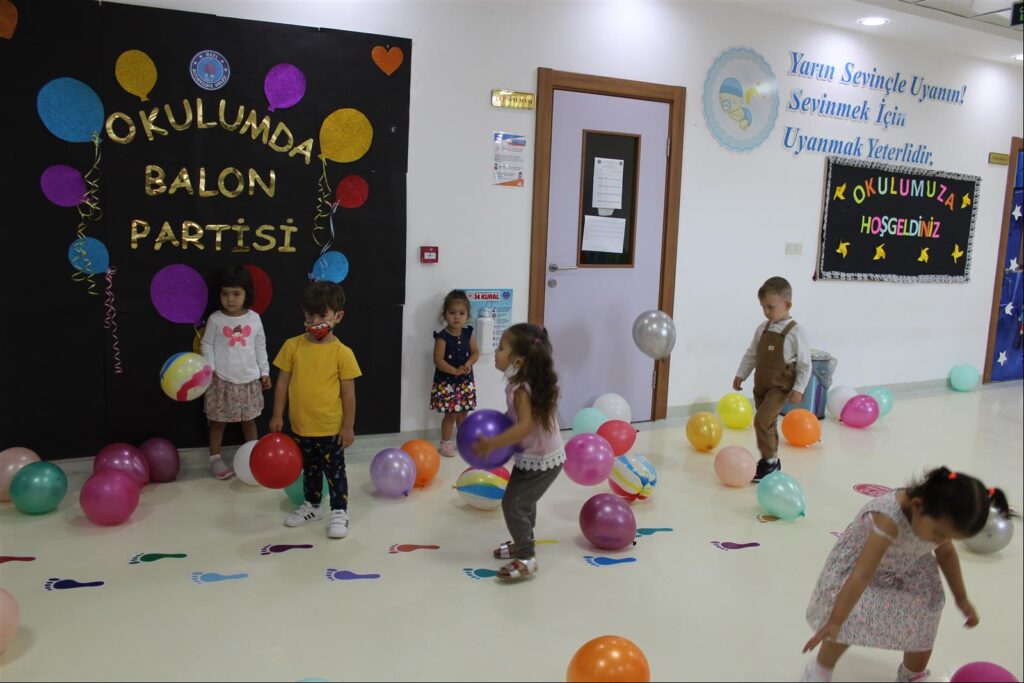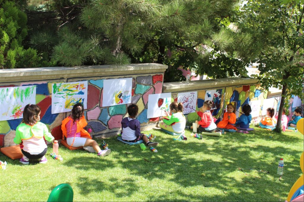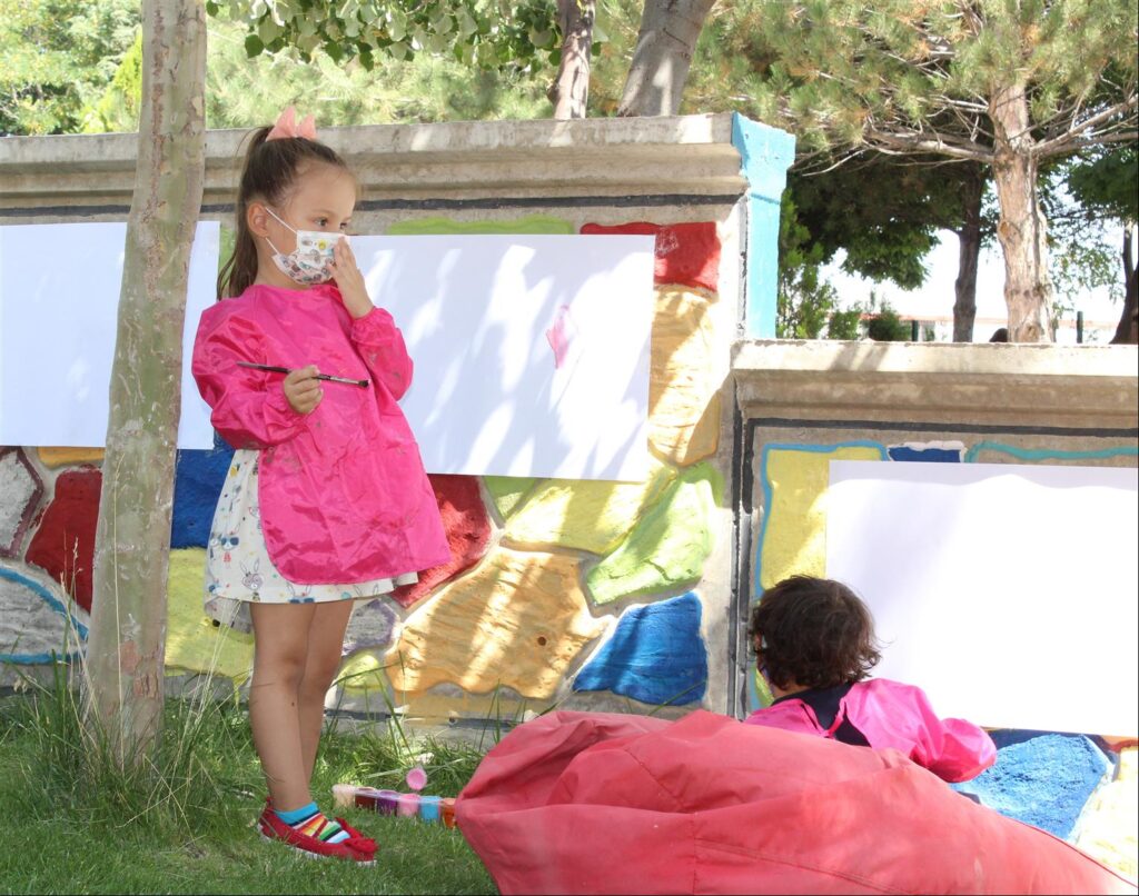 Renkli balonları patlatarak keyifli vakit geçiren öğrenciler, sosyal mesafeye uygun olarak bahçemizde resimler çizerek ufkularını açıyorlar.