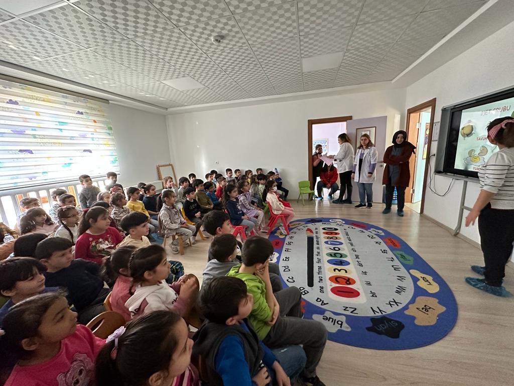 Kısa film ile minikler öğrendiklerini pekiştirdi. Eğitim sonunda sağlıklı yaşam için doğru beslenmeye dikkat edeceklerine dair öğretmenlerine söz verdiler.