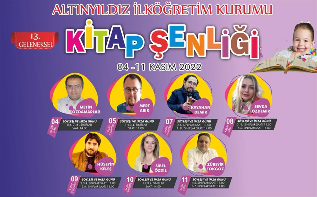 Bu sene 7 yazarın katılımıyla 13.sünü düzenleyeceğimiz geleneksel kitap şenliği etkinliklerimiz 04-11 KASIM 2022 tarihleri arasında gerçekleştirilecektir.