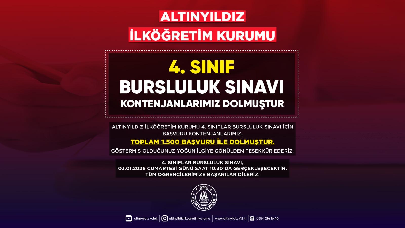 Altınyıldız İlköğretim Kurumunun 4. sınıflar bursluluk sınavı, her yıl olduğu gibi bu yılda da rekor bir başvuru aldı. Nevşehir Merkez ve tüm ilçelerden yoğun ilgi gören sınav, 1 haftalık sürede 1500 öğrenci başvurusuna ulaştı ve kontenjan tamamen dolarak başvurular kapandı.