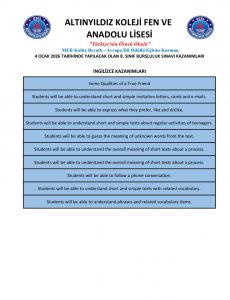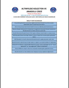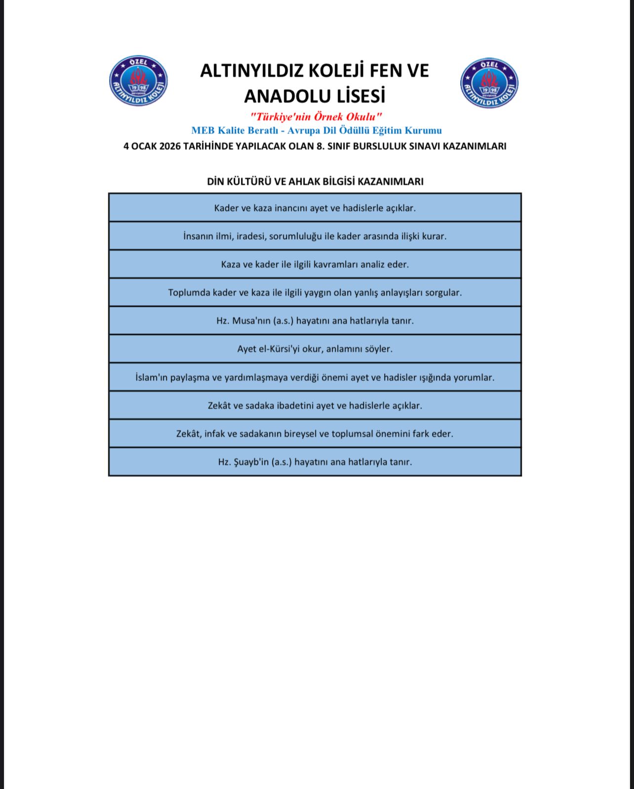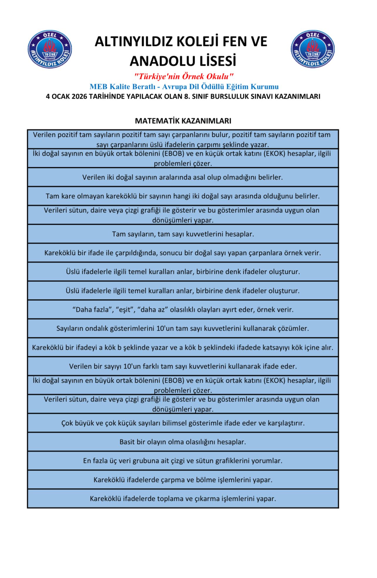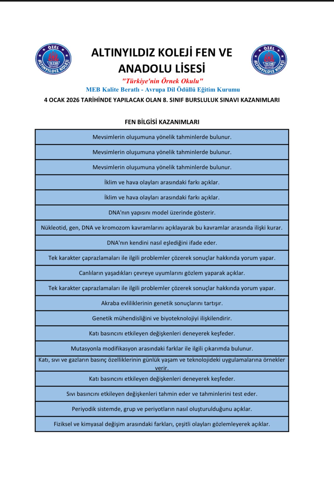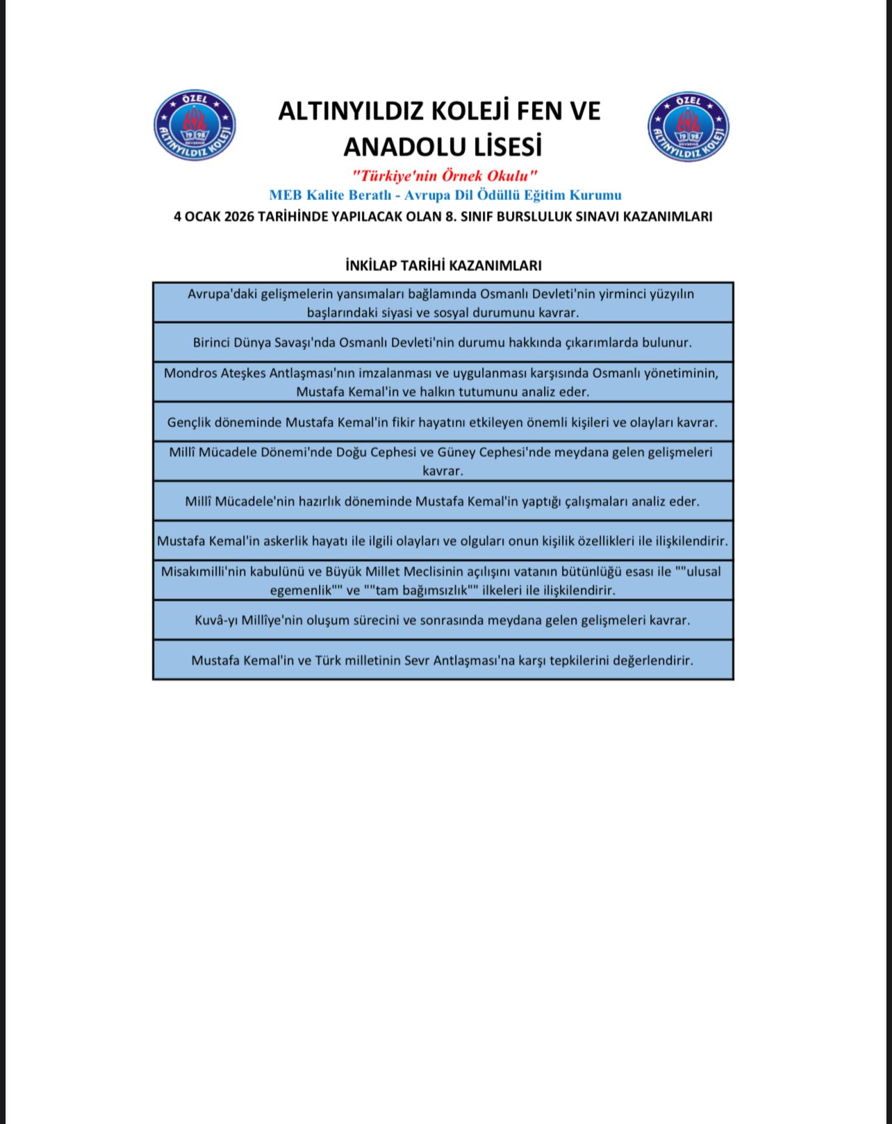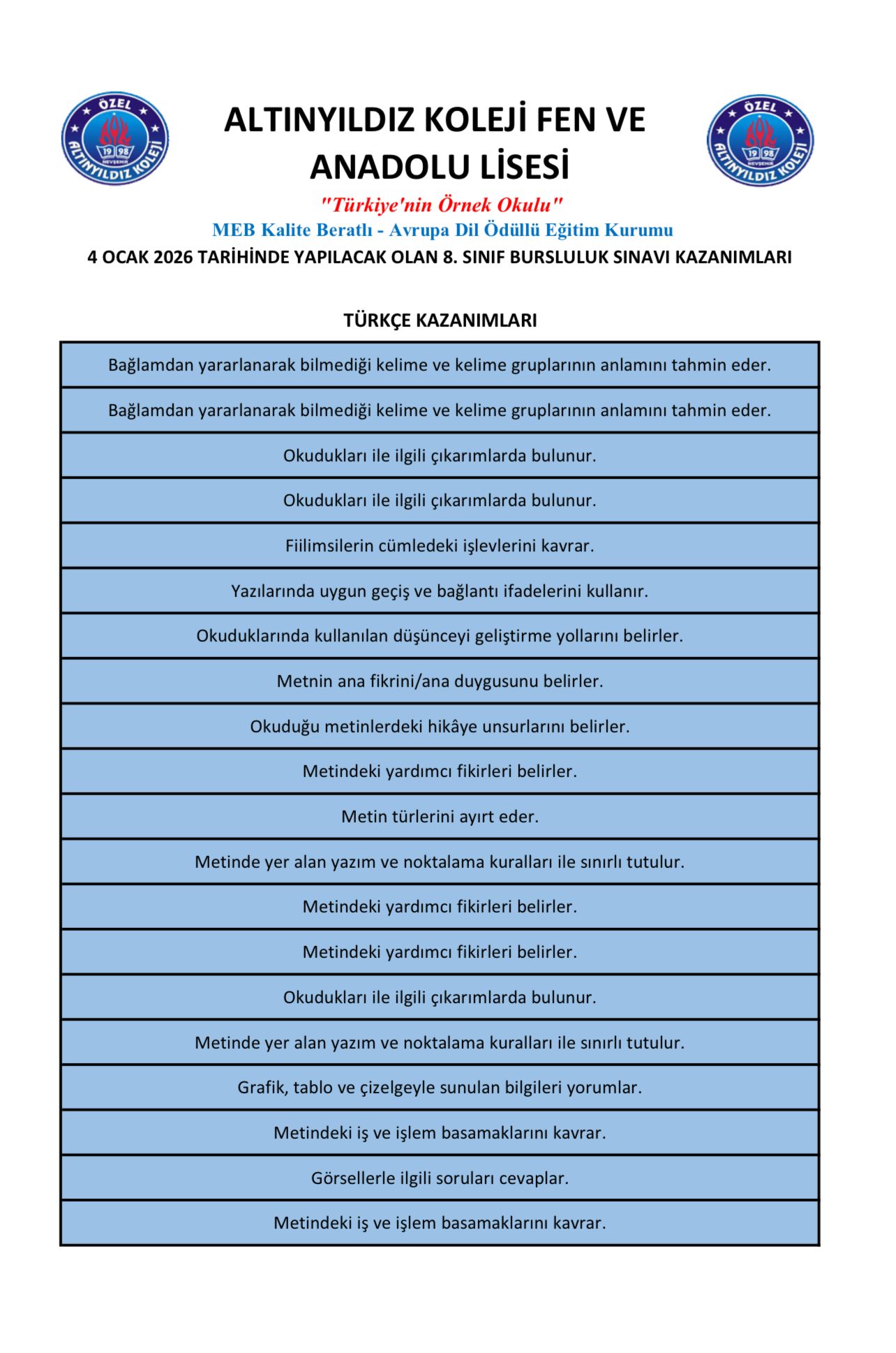 Altınyıldız Koleji 8. Sınıflar Bursluluk Sınavı, Nevşehir merkez ve ilçelerinde okuyan 8. Sınıf öğrencilerinden gelen yoğun başvurularla büyük ilgi görüyor. Nevşehir’de eğitimin lider kurumu Altınyıldız Koleji Fen ve Anadolu Lisesi 8. Sınıflar Okula Kabul ve Bursluluk Sınavı 4 Ocak 2026 Pazar günü saat 10.30’da Altınyıldız Koleji Lise Kampüsünde gerçekleşecektir. Sınavın konu kazanımları yayınlanmıştır. Yoğun ilgiden dolayı tüm velilere ve öğrencilere teşekkür ederiz.