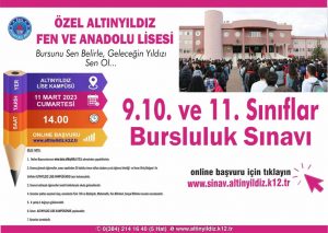 Altınyıldız Fen ve Anadolu Lisesi Nevşehir genelinde halen 9.10.ve 11.sınıflarda öğrenim gören öğrenciler için Bursluluk Sınavı düzenliyor. Sınav 11 Mart 2023 Cumartesi Günü Saat 14.00’da Altınyıldız Eğitim Kurumları Lise Kampüsünde yapılacak.