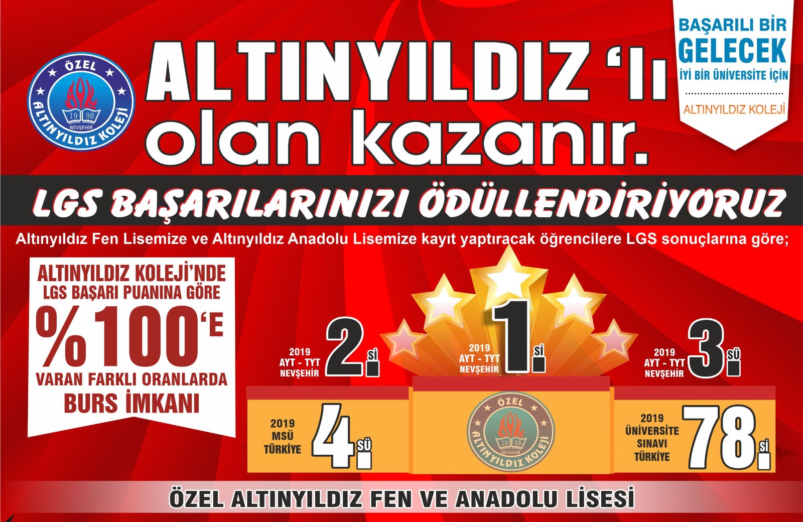 Altınyıldız İlköğretim Kurumu Müdürü Sayın MEHMET ERAVCI ‘Sınavın ismi değişse de ,başarının ismi yine Altınyıldız İlköğretim Kurumu olmuştur. Altınyıldız İlköğretim Kurumu kurulduğu günden bugüne Ortaöğretime geçiş sınavlarında 61 Türkiye 1.liği elde etmiş ve okul puan ortalamaları ile yıllardır Nevşehir 1.si okul olmuştur. Elde ettiği sınav puan ortalamaları ile akademik olarak,sosyo-kültürel alanlardaki başarıları ve Türkiye’nin en iyi okul kampüslerinden birine sahip olan Altınyıldız Eğitim Kurumları öğrencilerine sunduğu mükemmel öğretim imkanları,sosyal yaşam alanlarıyla ‘aklın ve bilimin ışığında’ Türkiye’nin geleceğini yetiştirmeye devam ediyor ve Nevşehir’in ve Türkiye’nin öncü okulu olmaya devam etmektedir.’dedi ve öğrencilerimiz NEVŞEHİR LGS 1.si KAAN CİVAN ve Nevşehir LGS 2.FURKAN MING LIANG HOU’yu tebrik ederek öğrencilerimiz altın ile ödüllendirdi.