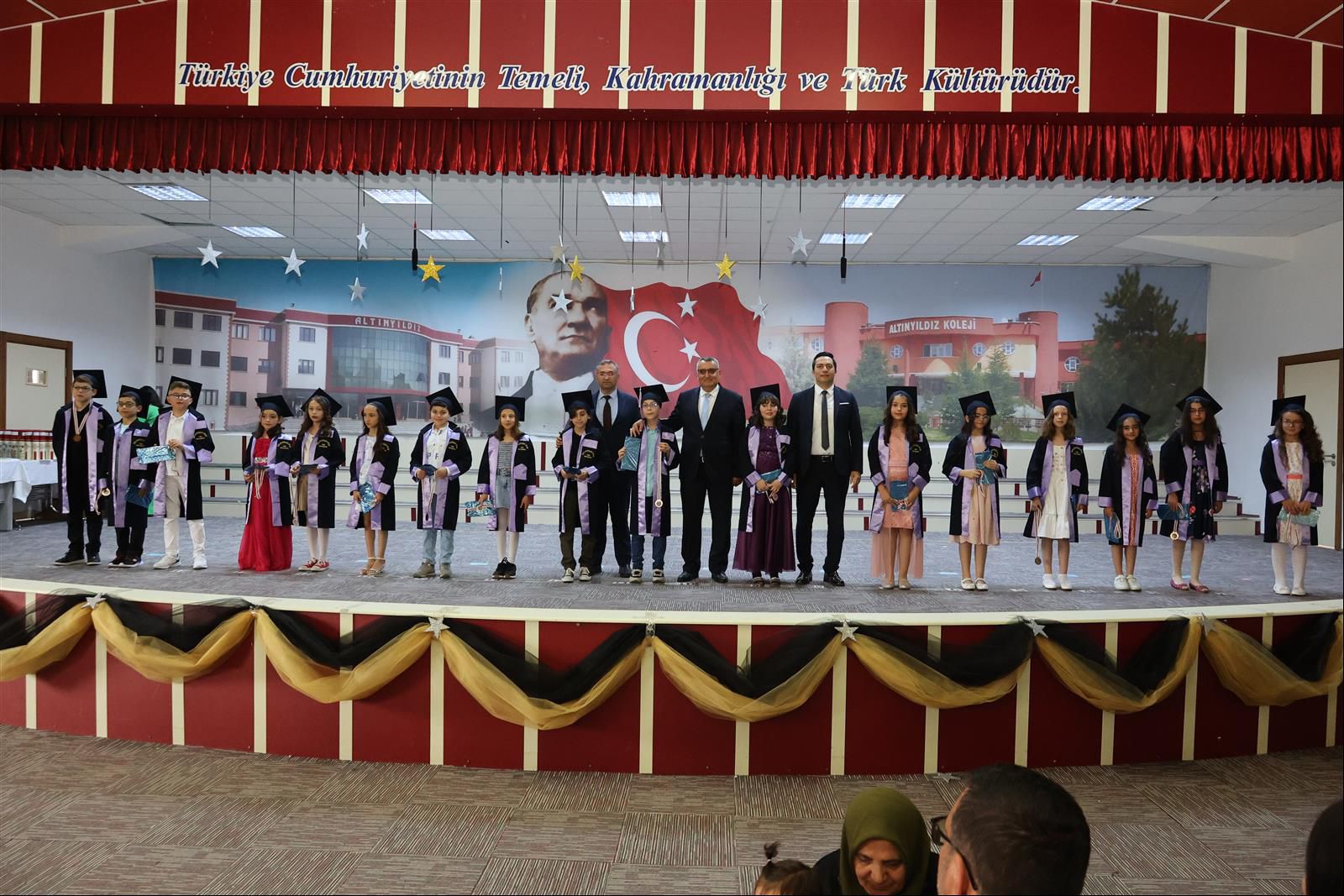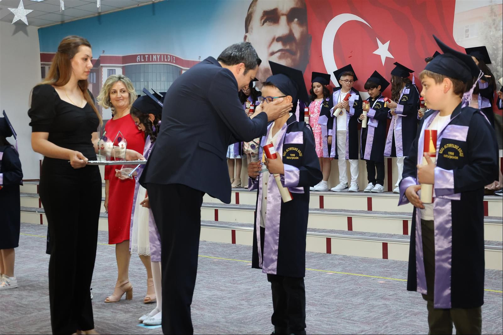 Saygı duruşu ve İstiklal Marşı’nın söylenmesinin ardından Altınyıldız İlköğretim Kurumu halk oyunları ekibinin gösterisi ve öğrencilerimizin oratoryosu ile izleyenlere sunuldu. Öğretmenler adına mezuniyet konuşmasını 4. Sınıf öğretmenlerimizden Sayın Ertan KAHVECİ yapmıştır. Ulusal ve uluslararası düzeyde yapılan Matfenburger, Tales ve Kanguru sınavlarında Türkiye dereceleri yapan öğrencilere hediyeleri ve madalyaları takdim edilmiştir. Altınyıldız İlköğretim Kurumundan mezun olan öğrencilerimizin plaketleri İlköğretim Kurum Müdürü Sayın Ahmet ÜNAL tarafından verilirken diplomaları öğretmenleri tarafından verildi. Diploma ve Plaketlerini alan Altın yürekli öğrencilerimiz günün anısına hazırladıkları kep atma törenini gerçekleştirdiler.