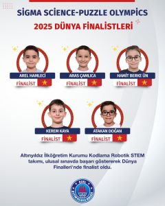 Dünya Finallerinde okulumuzu ve ilimizi temsil edecek öğrencilerimizin isimleri şu şekildedir; ATAKAN DOĞAN, KEREM KAYA, AREL HAMLECİ, ARAS ÇAMLICA ve H.BERKE ÜN.