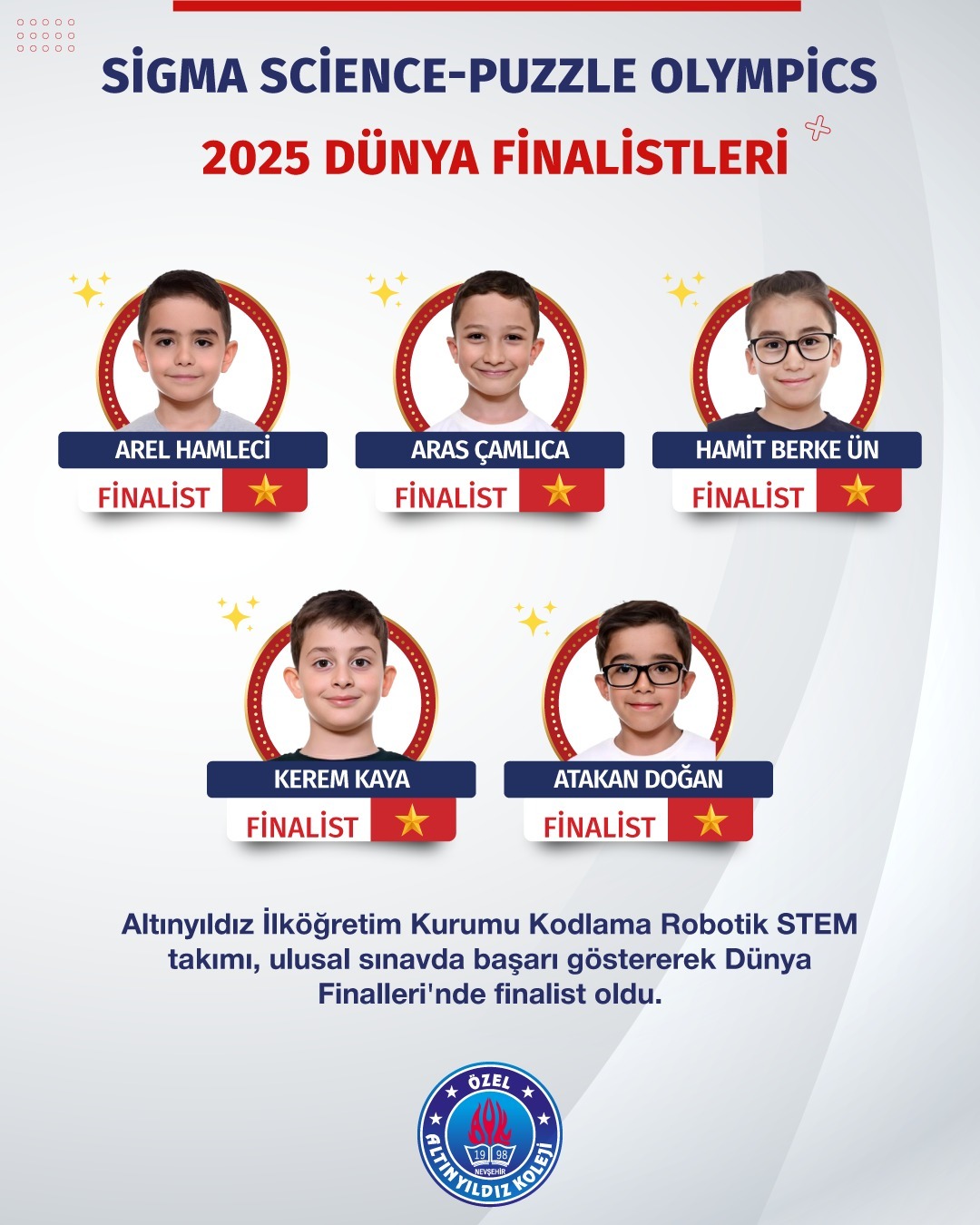 Türkiye genelinde faaliyet gösteren devlet okulları ve özel okulların bireysel ve okul takımlarıyla katılımı gerçekleşen; her sınıf düzeyinin katılımına açık ileri düzey yeni nesil sorularla derlenmiş sınava katılım sağlayan Altınyıldız İlköğretim Kurumu Kodlama Robotik STEM takımı öğrencileri gösterdikleri üstün başarıyla ilk aşama sınavını geçerek Dünya Finallerinde de adından söz ettirmeyi başararak finalist oldular.