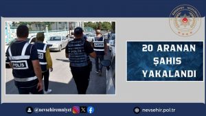 Nevşehir Emniyet Müdürlüğü Ekiplerince son bir hafta içerisinde ilimiz genelinde aranan şahıslara yönelik yapılan çalışmalarda 20 kişi yakalandı.