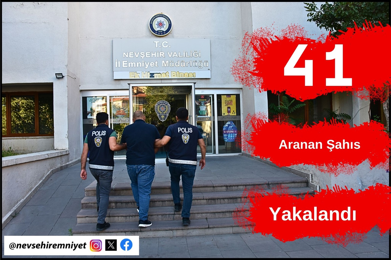 Nevşehir Emniyet Müdürlüğü Ekiplerince son iki hafta içerisinde ilimiz genelinde aranan şahısların yakalanmasına yönelik yapılan çalışmalarda 41 kişi yakalandı.27 yıl kesinleşmiş hapis cezası bulunan 1 şahıs, 3 yıl 10 ay 20 gün kesinleşmiş hapis cezası bulunan 1 şahıs, 3 yıl 4 ay kesinleşmiş hapis cezası bulunan 1 şahıs,3 yıl  kesinleşmiş hapis cezası bulunan 1 şahıs ve 2 yıl 8 ay kesinleşmiş hapis cezası bulunan 1 şahıs başta olmak üzere çeşitli suçlardan aranması bulunan 41 şahıs yakalandı. Şahıslardan 21 kişi çıkarılmış oldukları adli mercilerce serbest bırakılırken 20 şahıs tutuklanarak cezaevine teslim edildi.