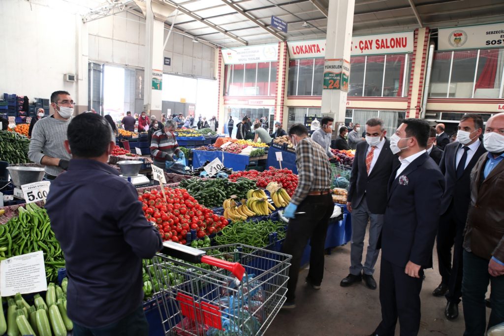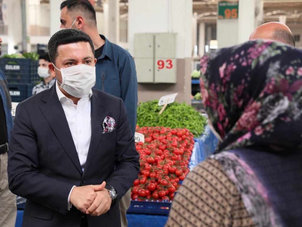 Pazar girişinde belediye standında bir süre vatandaşlara maske dağıtarak, alınan tedbirler ile ilgili Zabıta Müdürlüğü yetkililerinden bilgiler alan Arı, Pazar içerisinde esnaflarla ve alışveriş yapan vatandaşlarla bir süre sohbet etti.