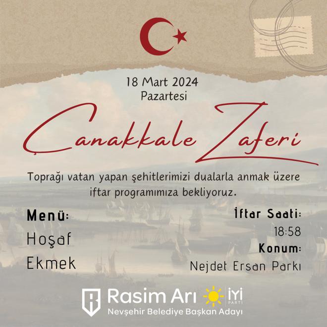 Ecdadımızın vatan için bu zaferi elde etmek ortaya koyduğu fedakarlığı bir nebze olsun içsellestırebilmek için iftarımızı da Hoşaf ve Ekmekle yapacağız diyen Başkan Adayı Arı, 18 Mart pazartesi günü tüm Nevşehir halkını Nejdet Ersan parkına davet etti.