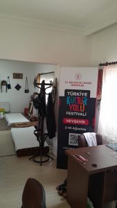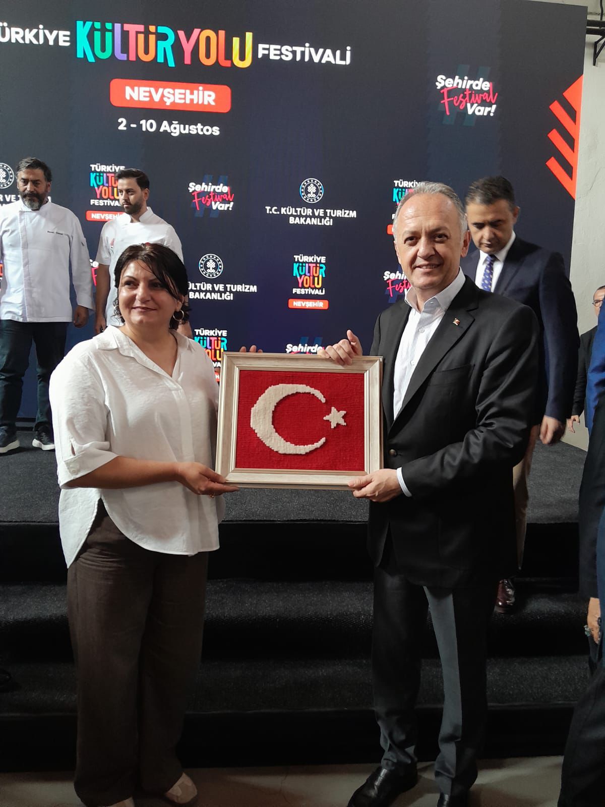 Kültür Yolu Festivali açılışın da Nevşehir Belediyesi Gençlik ve Spor Hizmetleri Müdürlüğü bünyesinde bulunan Halı Kilim Dokuma Kursu’nda Eğitmen Fatma Turgut, halı kilim atölyesinde dokunan Türk Bayrağımızı Kültür ve Turizm Bakan Yardımcısı Gökhan Yazgı’ya hediye etti.