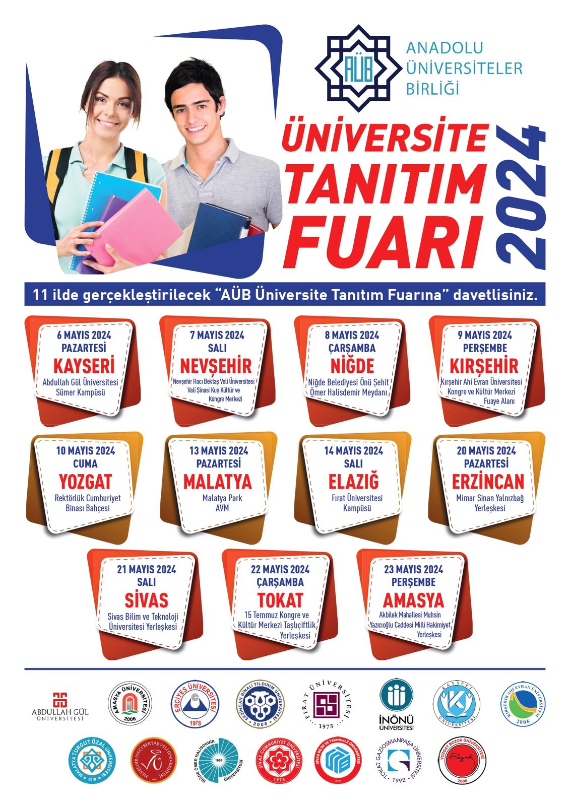Yükseköğretim Kurumları Sınavı (YKS) öncesi öğrencilere danışmanlık hizmeti sunmak ve tercih sürecinde destek olmak için yapılan fuara; aralarında NEVÜ, Abdullah Gül Üniversitesi, Amasya Üniversitesi, Erciyes Üniversitesi, Erzincan Binali Yıldırım Üniversitesi, Fırat Üniversitesi, İnönü Üniversitesi, Kayseri Üniversitesi, Kırşehir Ahi Evran Üniversitesi, Malatya Turgut Özal Üniversitesi, Niğde Ömer Halisdemir Üniversitesi, Sivas Cumhuriyet Üniversitesi, Sivas Bilim ve Teknoloji Üniversitesi, Tokat Gaziosmanpaşa Üniversitesi ve Yozgat Bozok Üniversitesi’nin de bulunduğu 15 devlet ve vakıf üniversitesi katılacak.