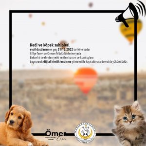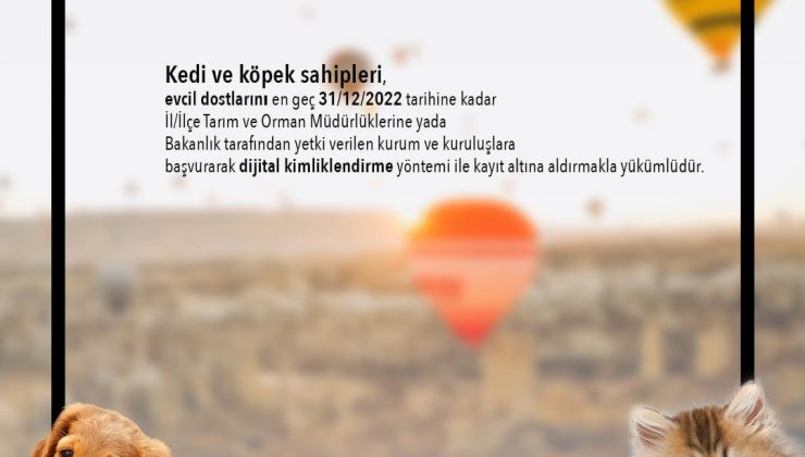 Açıklamada, “Kedi ve köpek sahipleri, evcil dostlarını en geç 31/12/2022 tarihine kadar İl/İlçe Tarım ve Orman Müdürlüklerine yada Bakanlık tarafından yetki verilen kurum ve kuruluşlara başvurarak dijital kimliklendirme yöntemi ile kayıt altına aldırmakla yükümlüdür” denildi.