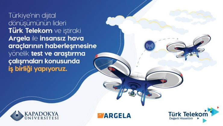 Türkiye’nin dijital dönüşümünün lideri Türk Telekom ve iştiraki Argela, insansız hava araçlarının haberleşmesine yönelik test ve araştırma çalışmaları konusunda Kapadokya Üniversitesi ile iş birliği yaptı. Proje ile, insansız hava araçları/drone haberleşmesinde 3G/4,5G şebekesinin kullanımına yönelik altyapı hazırlığı sağlanması hedefleniyor. Çalışma 5G sistemleriyle geliştirilecek ürünlere de zemin oluşturacak.