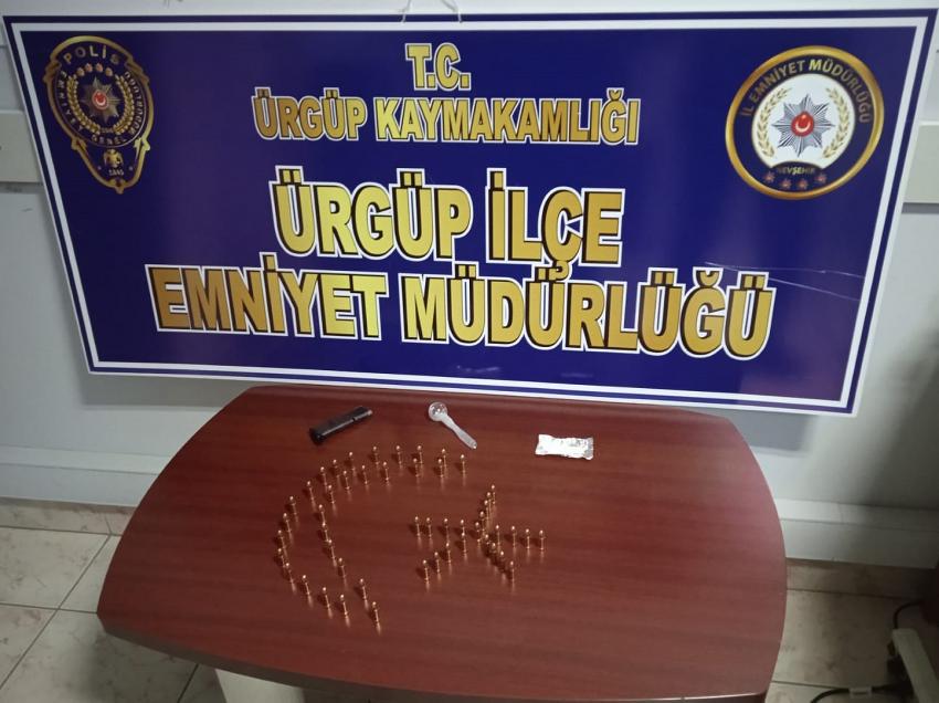 Alınan bilgilere göre, Ürgüp İlçe Emniyet Müdürlüğü ekipleri tarafından şüphe üzerine durdurulan H.T.’nin yapılan aramasında 2,2 gram metamfetamin ve aracında 50 adet 9 mm çapında tabanca mermisi, boş vaziyette tabanca şarjörü, 1 adey uyuşturucu kullanılmakta kullanılan puyp ele geçirildi. Polis ekipleri tarafından gözaltına alınan H.T.’nin emniyetteki işlemlerinin ardından sevk ediliği adli makamlarca adli işlem başlatıldığı öğrenildi.