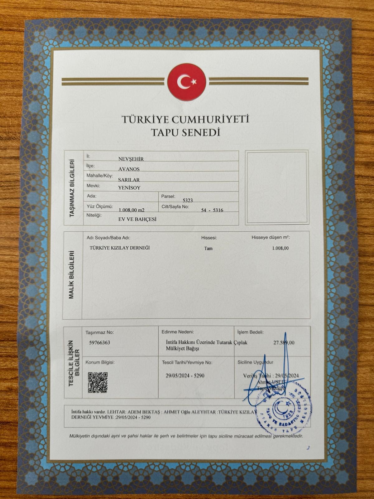Türk Kızılay Nevşehir İl Merkezi Başkanı Ercan Civelek, hayırsever bağışçıdan Nevşehir Avanos ilçesi sınırlarında bulunan müstakil ev ve bahçesini Avanos Tapu Müdürlüğünden Türkiye Kızılay Derneği adına devraldı. Türk Kızılay İl Merkez Başkanı Ercan Civelek, bağışta bulunan vatandaşa teşekkür ederek, yapılan bu hayrın kendisi için sadaka-i cariye olması hususunda dua ve temenni de bulundu.