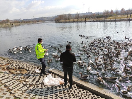 Polisler Kızılırmak’ta bulunan kaz ve ördekleri besledi