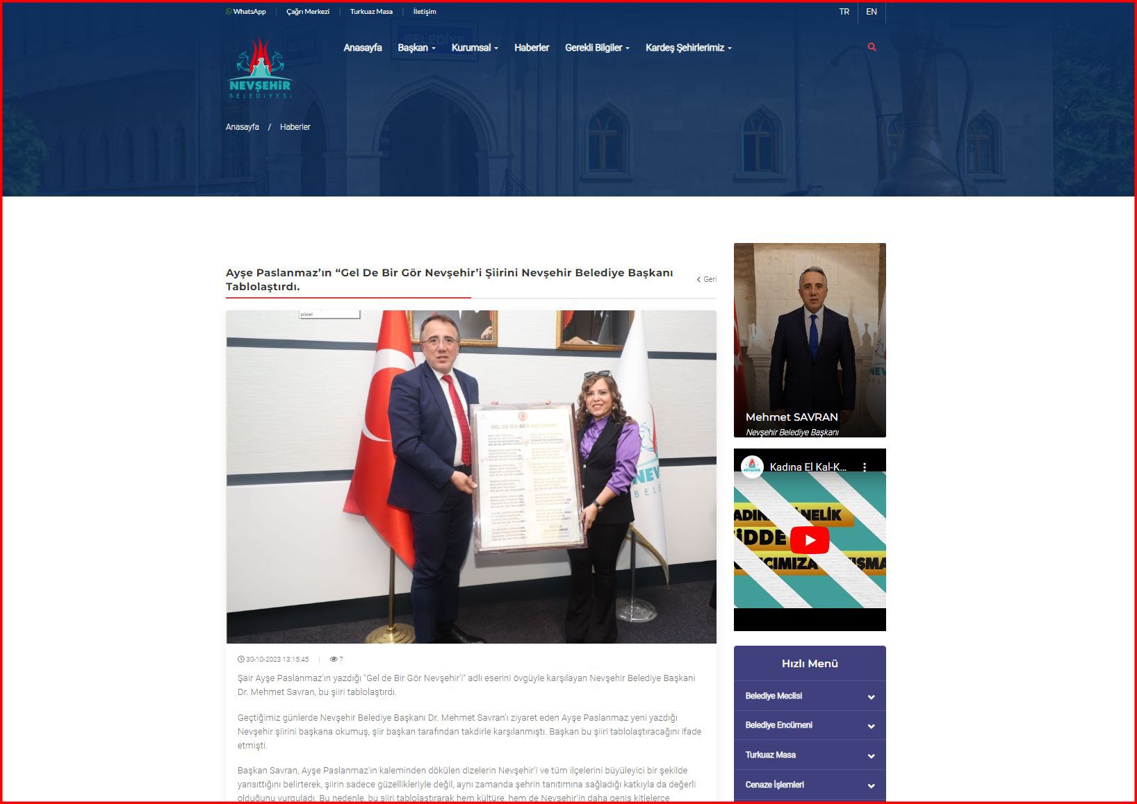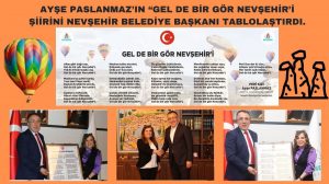 Geçtiğimiz günlerde Nevşehir Belediye Başkanı Dr. Mehmet Savran’ı ziyaret eden Ayşe Paslanmaz yeni yazdığı Nevşehir şiirini başkana okumuş, şiir başkan tarafından takdirle karşılanmıştı. Başkan bu şiiri tablolaştıracağını ifade etmişti.