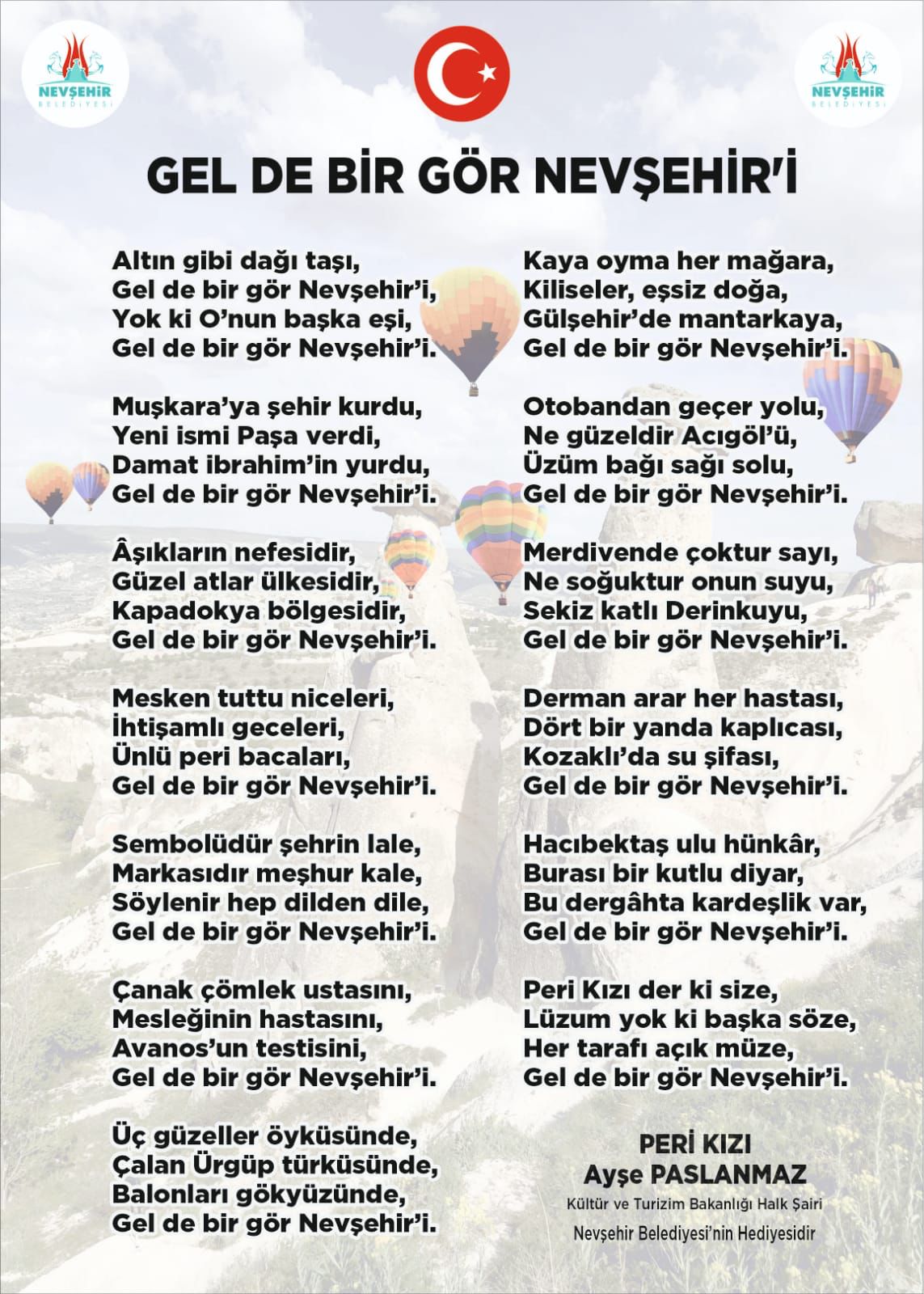 “Bir Nevşehir sevdalısı olarak doğduğum topraklara vefa borcumu ödemek adına, uzun süredir üzerinde çalıştığım her dörtlüğü Nevşehir’i ve ilçelerini kucaklayan şiirimi kaleme aldım. Başkanımızın şiire verdiği değer ve destek, şehrimiz adına büyük bir kazanımdır,” dedi.