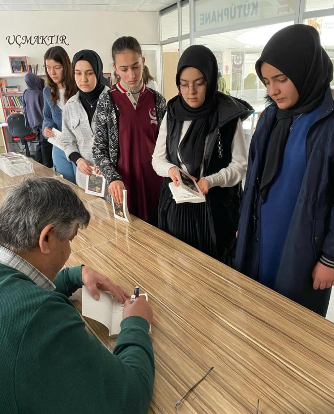 Aytekin söyleşi sonrası “Nevşehirli Kahramanlar Harp Hikayeleri” isimli kitabını öğretmen ve öğrencilere imzaladı.