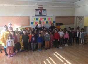 “Dilimiz Zenginliğimizdir” projesi kapsamında eğitici ve öğretici öykü ve masallar okuyan Aytekin öğrencilere ayrıca kendisinin çizip renklendirdiği aile, bitkiler, yiyecekler, hayvanlar ve iş aletlerinin resimlerini çocuklara gösterdi. Çocuklar resimlerde yer alan figürler, bitkiler ve nesneleri heyecanla anlattılar.