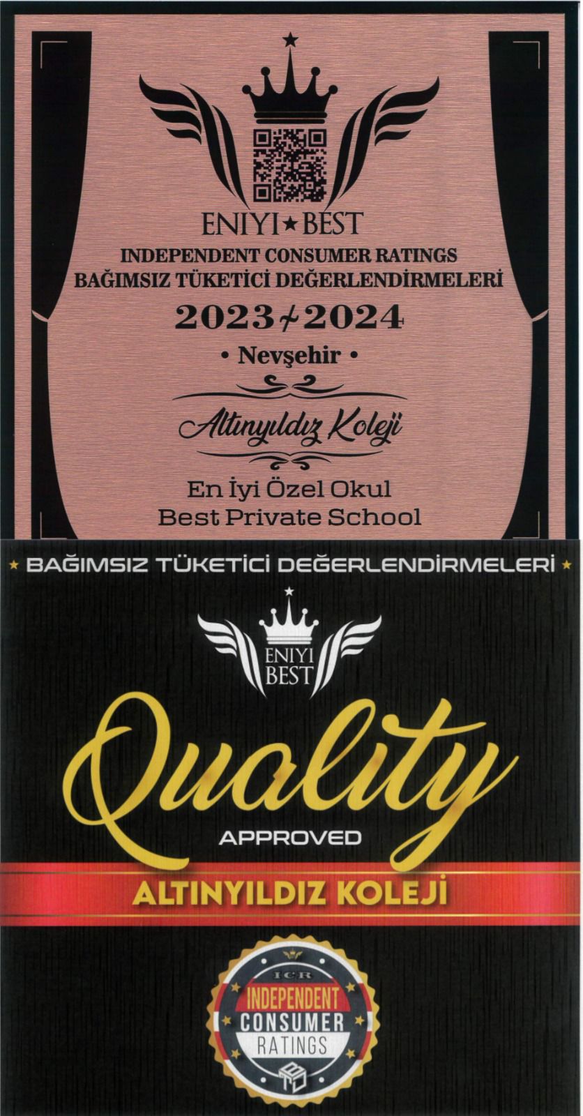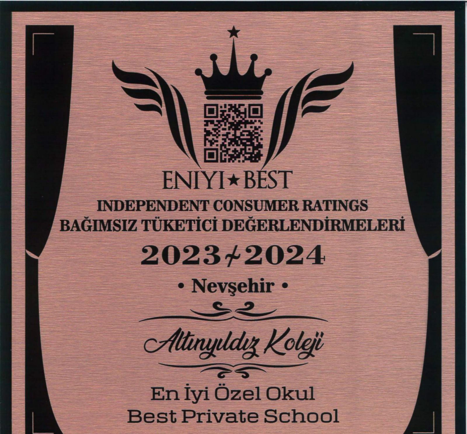 BAĞIMSIZ TÜKETİCİ DEĞERLENDİRMELERİ (INDEPENDENT CONSUMER RATINGS) “2023-2024 EN İYİ ÖZEL OKUL” Hizmet Kategorisi değerlendirmeleri sonucunda insanlardan en çok oy alarak Eğitim alanında Nevşehir’in En İyi Özel Okulu (Best Private School) Altınyıldız Koleji seçildi.