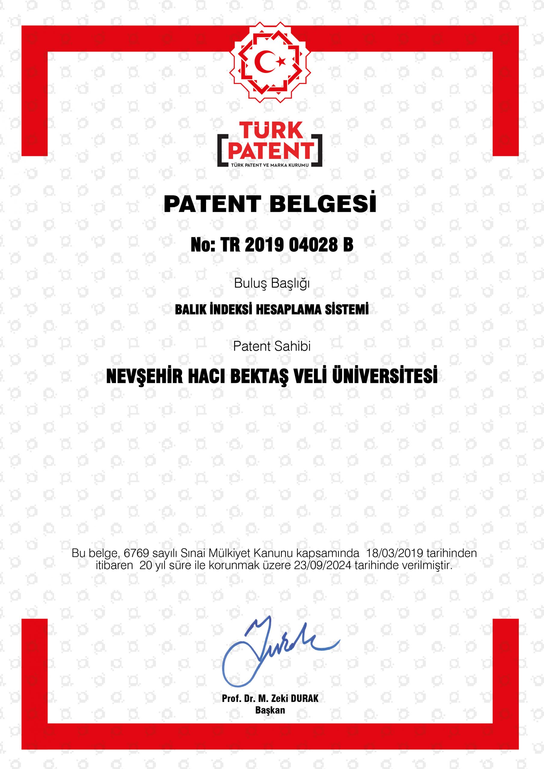 NEVÜ adına; Fen Edebiyat Fakültesi Biyoloji Bölümü öğretim üyeleri Prof. Dr. Erdoğan Çiçek ve Doç. Dr. Sevil Sungur, Hacıbektaş Teknik Bilimler Meslek Yüksekokulu öğretim elemanları Öğr. Gör. Alper Görgün ve Öğr. Gör. Orçun Bağra’nın biyolojik materyallerin su kalitesinin belirlenmesinin yanı sıra izlenmesi amacıyla kullanılmasını içeren ve balıkların değerlendirilmesi için bir balık indeksi hesaplama sistemine odaklayan “Balık İndeksi Hesaplama Sistemi” başlıklı buluşları, TÜRKPATENT tarafından tescillendi.