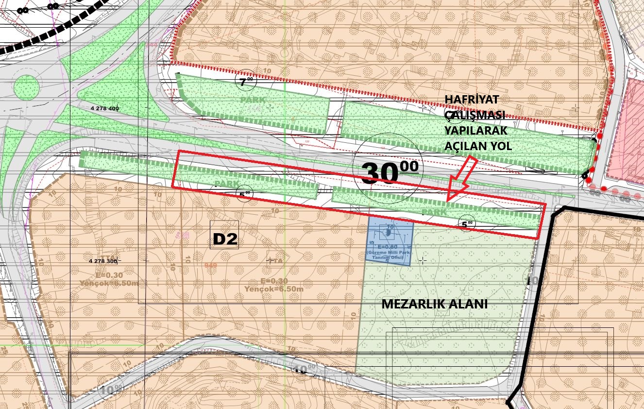 Koruma amaçlı imar planında yol ve park olarak ayrılan alanda Ürgüp Belediyesi tarafından yol çalışması yapılıyor.