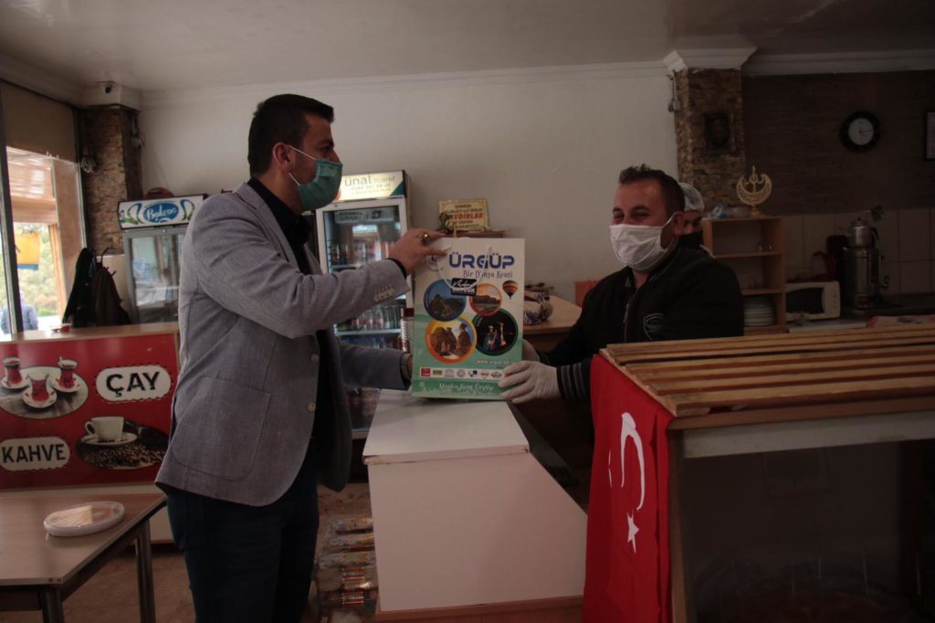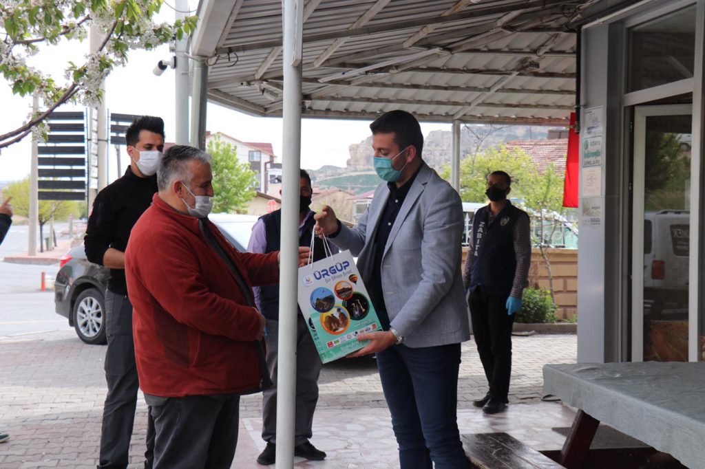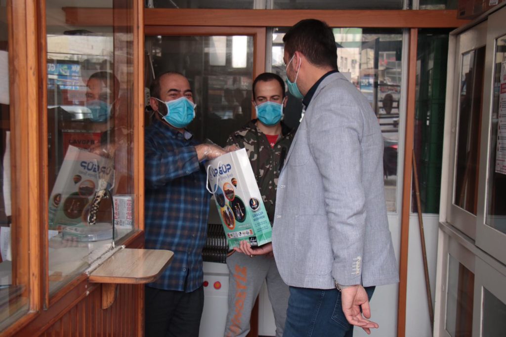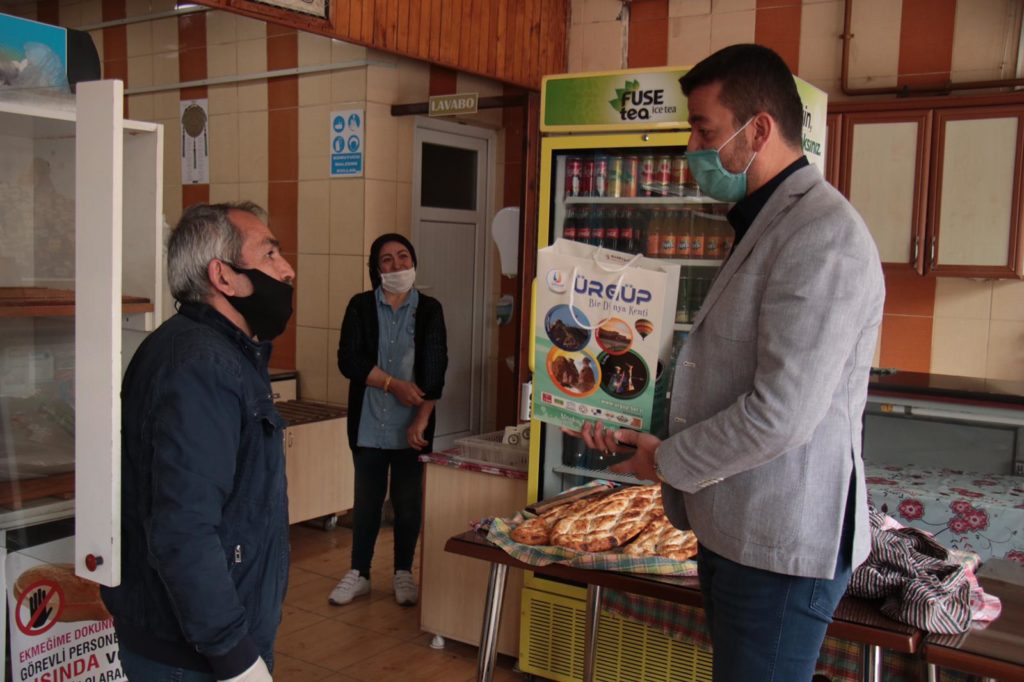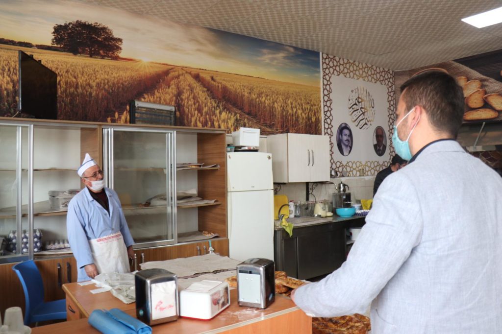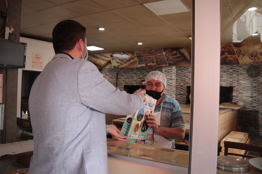 Fırınlarda hijyenin önemini vurgulayan Başkan Aktürk, ziyaret ettiği 15 fırına dezenfektan, maske ve kolonyadan oluşan hijyen seti hediye etti.