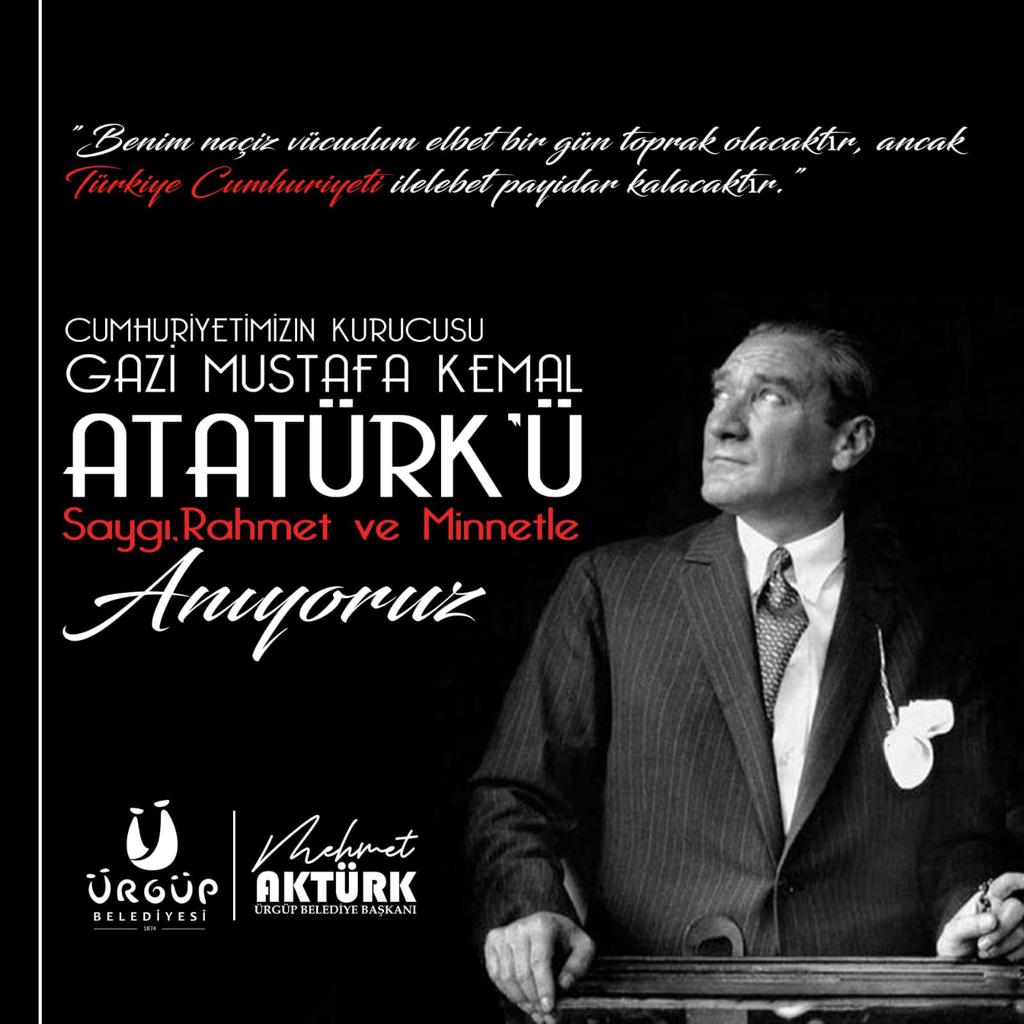 Ürgüp Belediye Başkanı Mehmet Aktürk, Türkiye Cumhuriyeti’nin kurucusu Gazi Mustafa Kemal Atatürk’ün vefatının yıldönümü dolayısıyla yayınladığı mesajında, “Türkiye Büyük Millet Meclisi’nin ilk Başkanı, Kurtuluş Savaşımızın Başkomutanı ve Türkiye Cumhuriyeti’nin kurucusu Gazi Mustafa Kemal Atatürk’ü, aramızdan ayrılışının 84. yılında sevgi, saygı ve rahmetle anıyorum.” Dedi.
