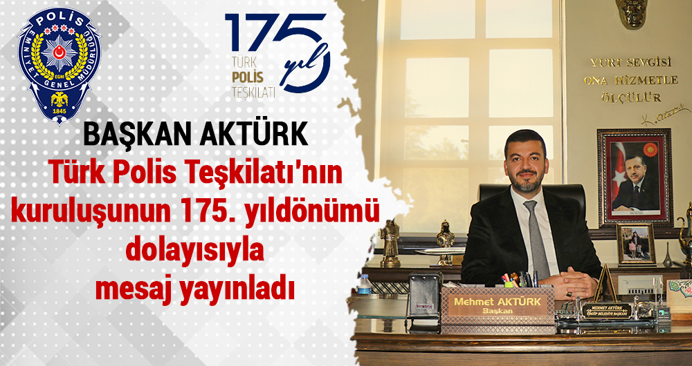 Başkan Aktürk mesajında; “ Vatandaşlarımızın huzur ve güven içerisinde yaşayabilmesi için gecesini gündüzüne katan, nice fedakarlıklara göğüs gererek zor şartlarda çalışan Polis Teşkilatımızın 175. Kuruluş yıldönümünü yürekten kutluyor, tüm polislerimize görevlerinde üstün başarılar temenni ediyorum.
