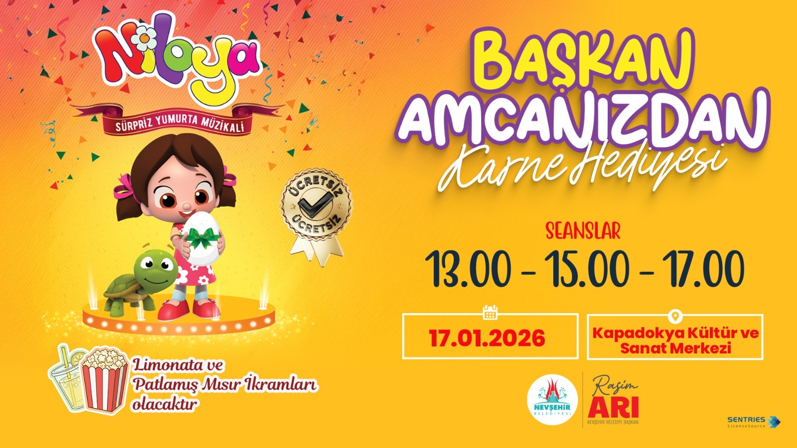 Nevşehir Belediyesi tarafından çocukların ara tatillerini dolu dolu geçirmeleri için 17 Ocak 2026 Cumartesi günü Kapadokya Kültür ve Sanat Merkezi’nde düzenlenecek Niloya Müzikali için tüm çocuklar ve aileleri davet edildi.