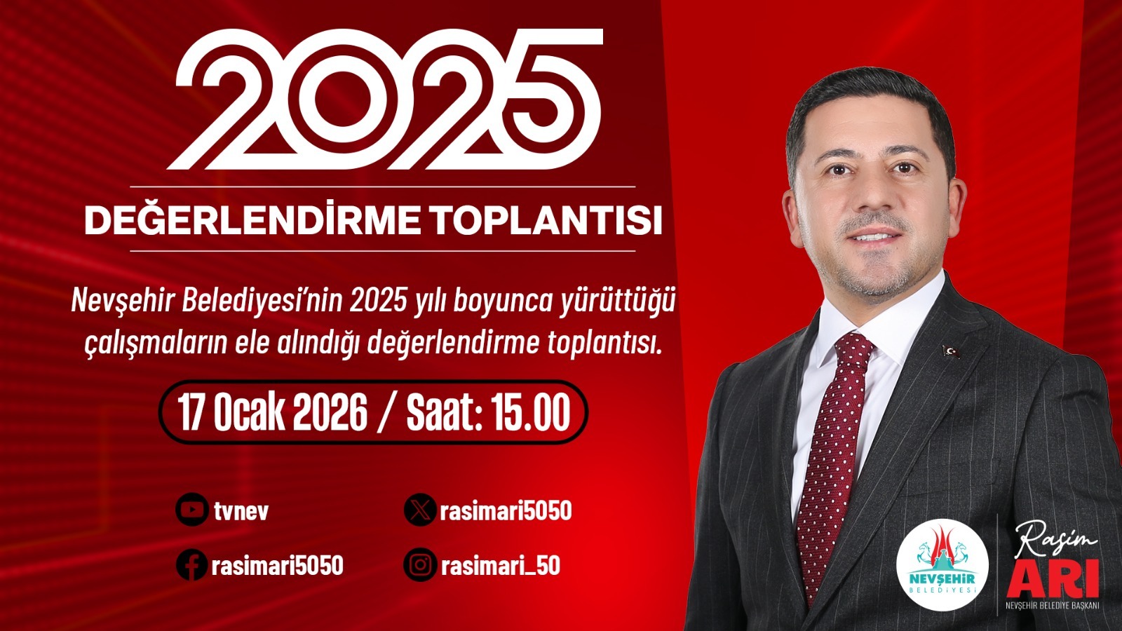 TvNev facebook dijital sayfası ve Belediye Başkanımız Rasim Arı’ya ait bütün sosyal medya platformlarından canlı yayınlanacak olan programda Nevşehir Belediyesi’nin 2025 yılı boyunca yürüttüğü çalışmalar geniş kapsamlı ele alınacak.