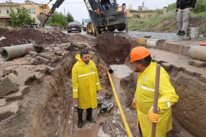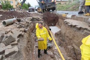 Belediye ekiplerinin sağanak yağış altında gerçekleştirdiği çalışmaları yerinde inceleyen Belediye Başkanı Rasim Arı, Su ve Kanalizasyon Müdürlüğü ekiplerinden bilgi aldı.