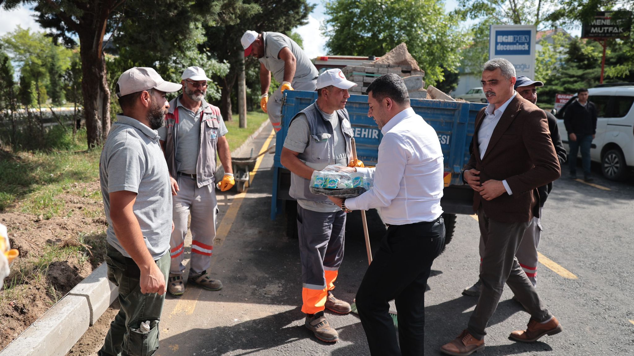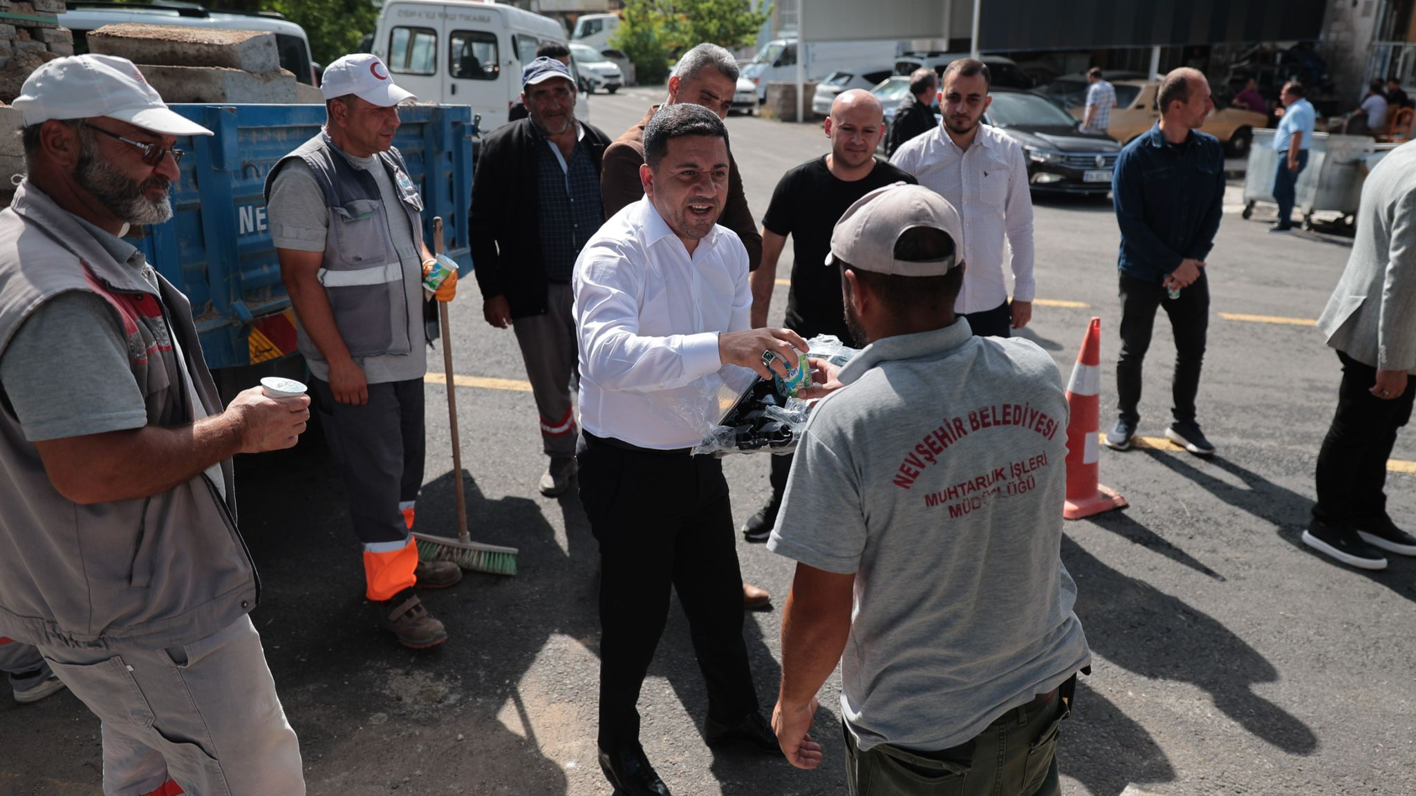 Kendi kullandığı vakumlu süpürge aracı ile temizlik çalışmalarına katılan Arı, belediye personellerine ayran ikramında bulundu.