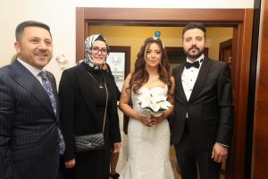 Aracın şoför koltuğuna oturan Başkan Arı’nın eşi Melek Arı hanımefendi ise gelin arabasında yerini alarak Başkan Arı’ya eşlik etti. Kaçanünlü ve Akbaş ailelerinin evlatları Ceren ve Durmuş çiftine bir ömür boyu mutluluklar dileyen Başkan Arı, kalabalık bir topluluğun katıldığı düğün merasiminde çiftin nikâhını kıydı.