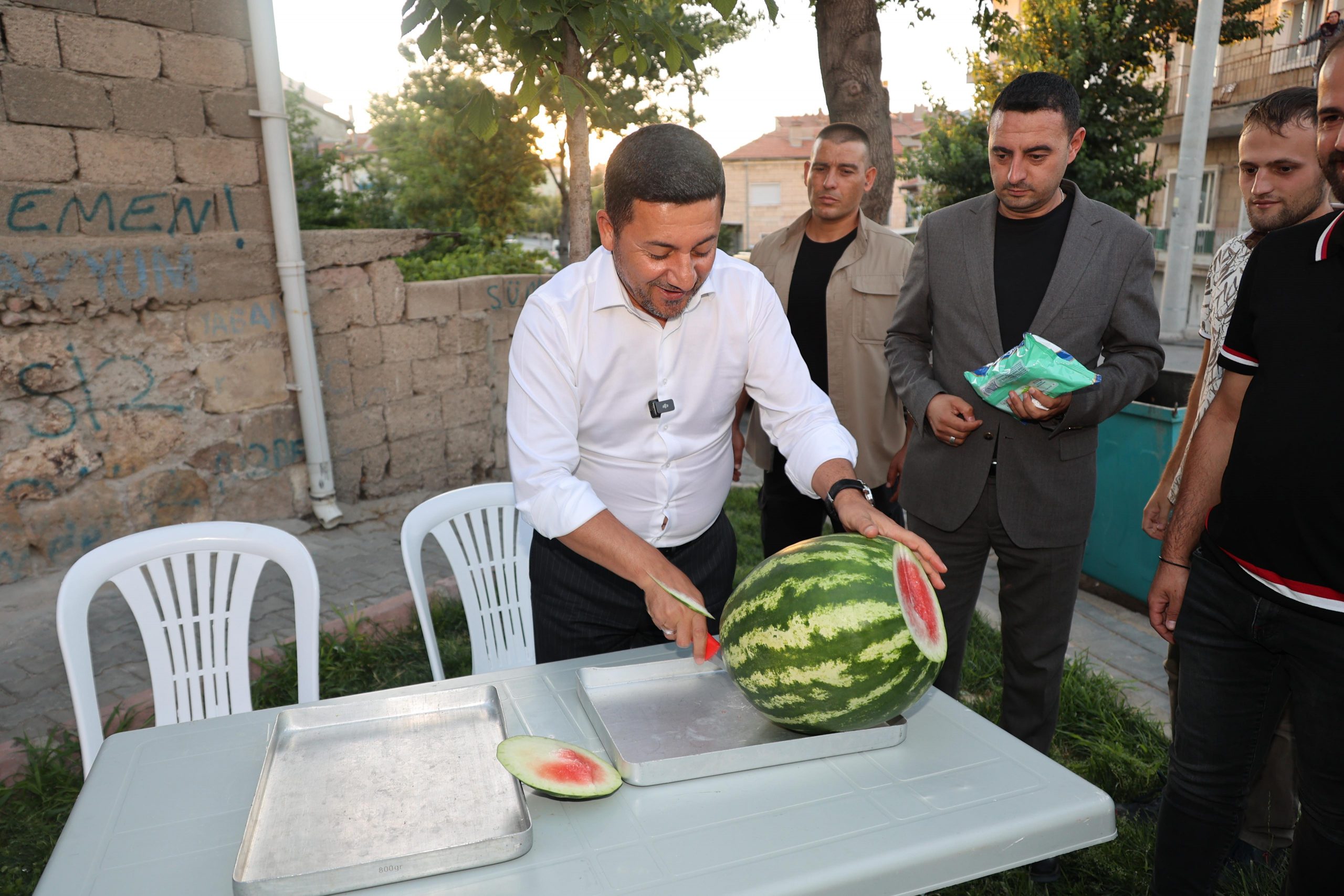 Belediye Başkanı Rasim Arı, şehri adeta karış karış gezerek vatandaşlarla buluşmayı sürdürüyor. Gün boyu belediye ekiplerinin çeşitli mahallelerinde çalışma alanlarını gezen ve incelemelerde bulunan Arı, akşam saatlerinde ise Sümer Mahallesi’ndeydi. Burada mahalle sakinleri ile bir araya gelen Başkan Arı, vatandaşlara kendi kestiği karpuzlardan ikram etti.