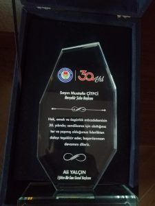 Başkan Çiftci, “54. Başkanlar Kurulunda başarı plaketimizi Genel Başkanımız Sayın Ali Yalçın’ dan tüm teşkilatımız adına aldık. Emek, gönül ve ömür veren tüm teşkilatımıza şükranlarımı sunuyorum. Biz birlikte kocaman bir aileyiz” ifadelerinde bulundu.