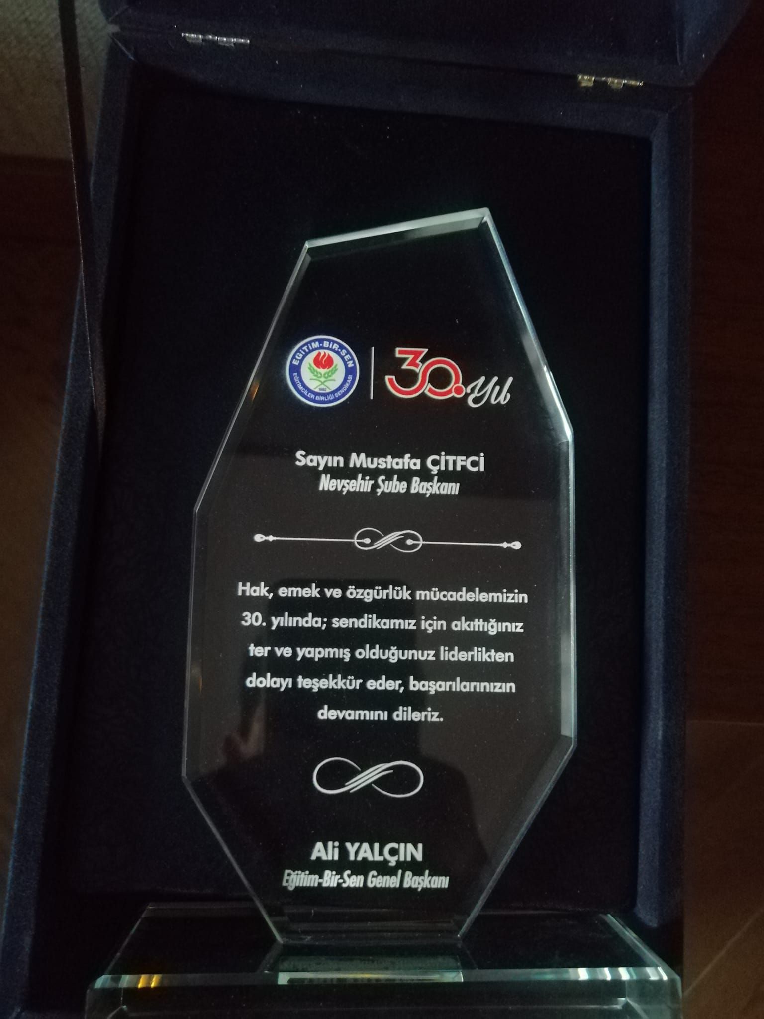 Memur-Sen İl Başkanı ve Eğitim-Bir-Sen Nevşehir Şube Başkanı Mustafa Çiftci’ye Memur-Sen ve Eğitim-Bir-Sen Genel Başkanı Ali Yalçın tarafından teşekkür plaketi takdim edildi.