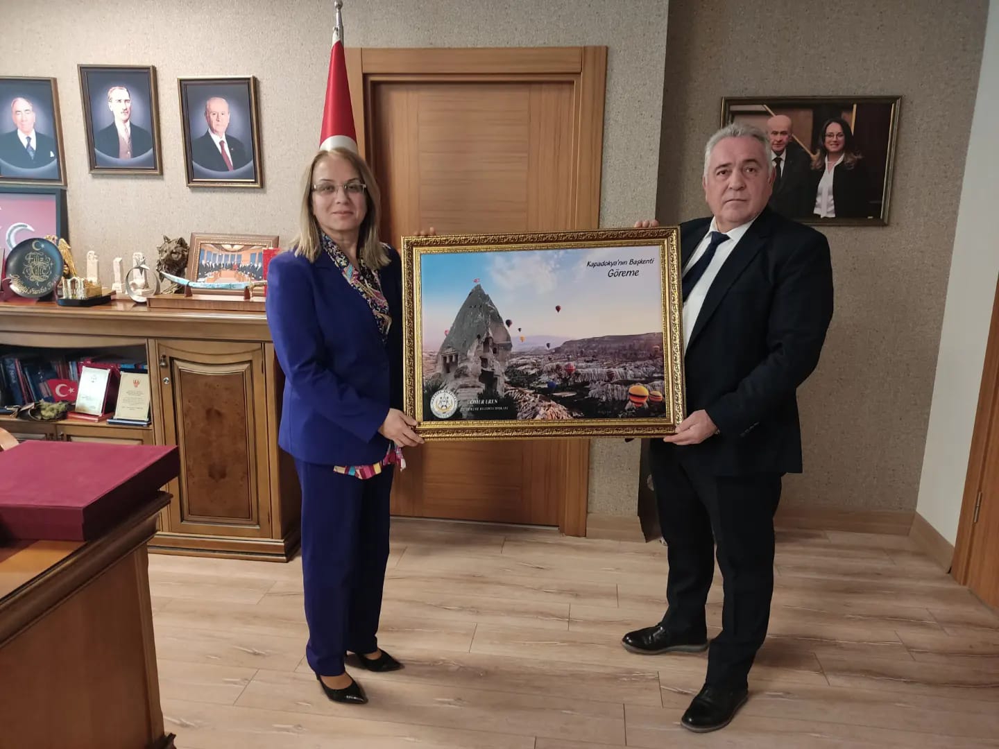 MHP MYK üyesi ve parti İçi Eğitim, Siyaset ve Liderlik Okulundan Sorumlu Genel Başkan Yardımcısı Prof. Dr. Filiz Kılıç’ı, makamında ziyaret eden Göreme Belediye Başkanı Ömer Eren ziyaretin anısına kendisine bir de Kapadokya portresi hediye etti.