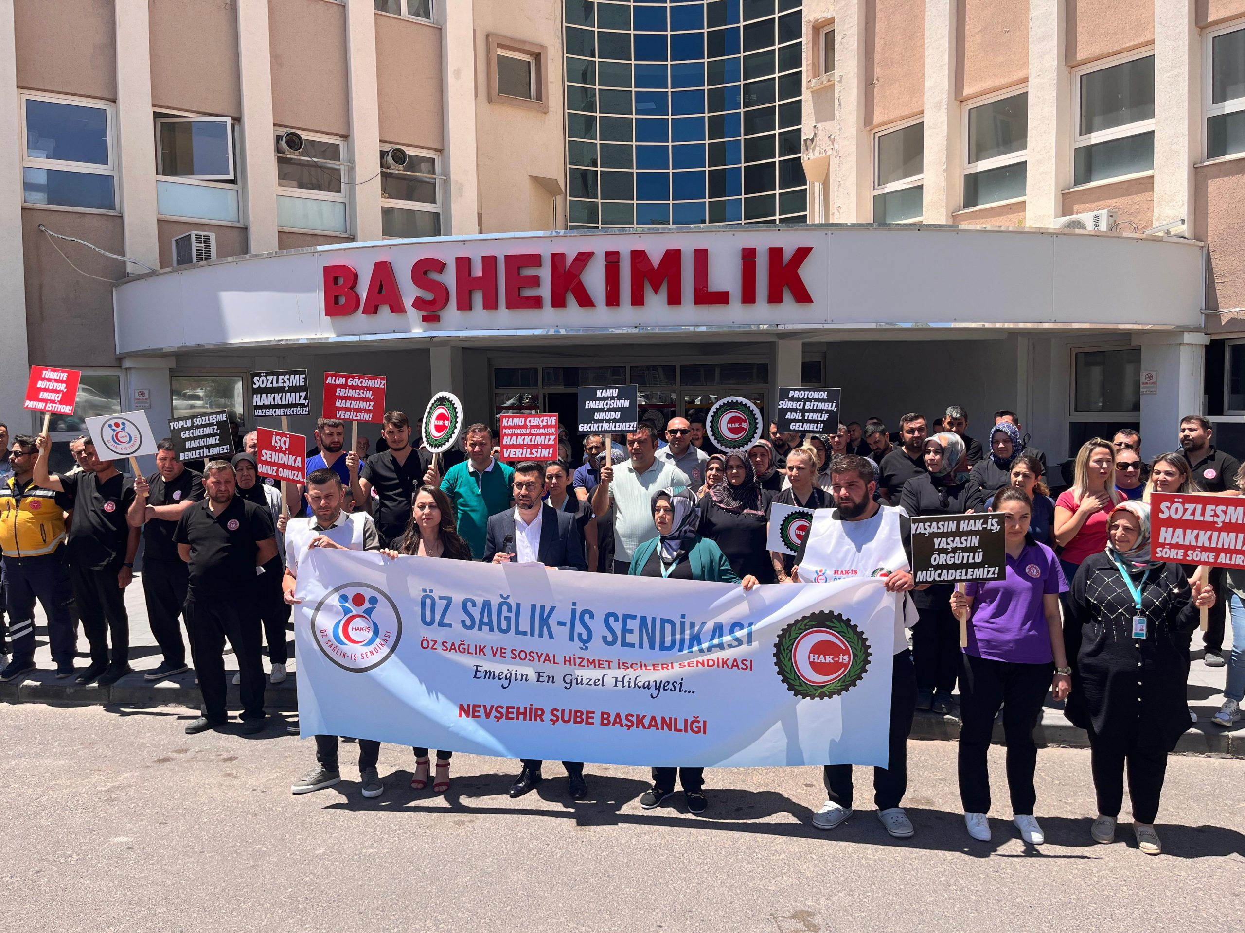 HAK-İŞ Konfederasyonu Nevşehir İl Başkanı ve Öz Sağlık-İş Sendikası Nevşehir Şube Başkanı Muhammet Fatih Mutlu, Nevşehir Devlet Hastanesi Başhekimlik önünde yaptığı açıklamayla kamu işçilerine yönelik toplu sözleşme sürecinde yaşanan belirsizliğe dikkat çekti.