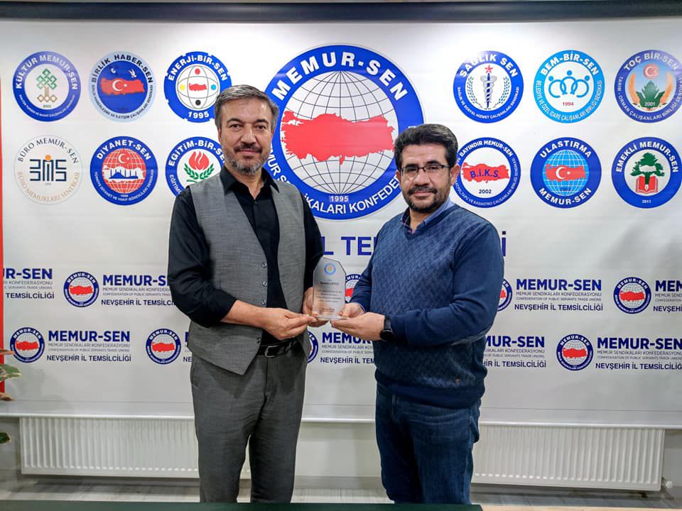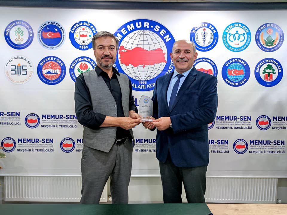 Eğitim-Bir-Sen Nevşehir Şube Başkanı Harun Öcal, sendikanın önceki dönem şube başkanı ve yöneticilerine teşekkür plaketi takdim etti.